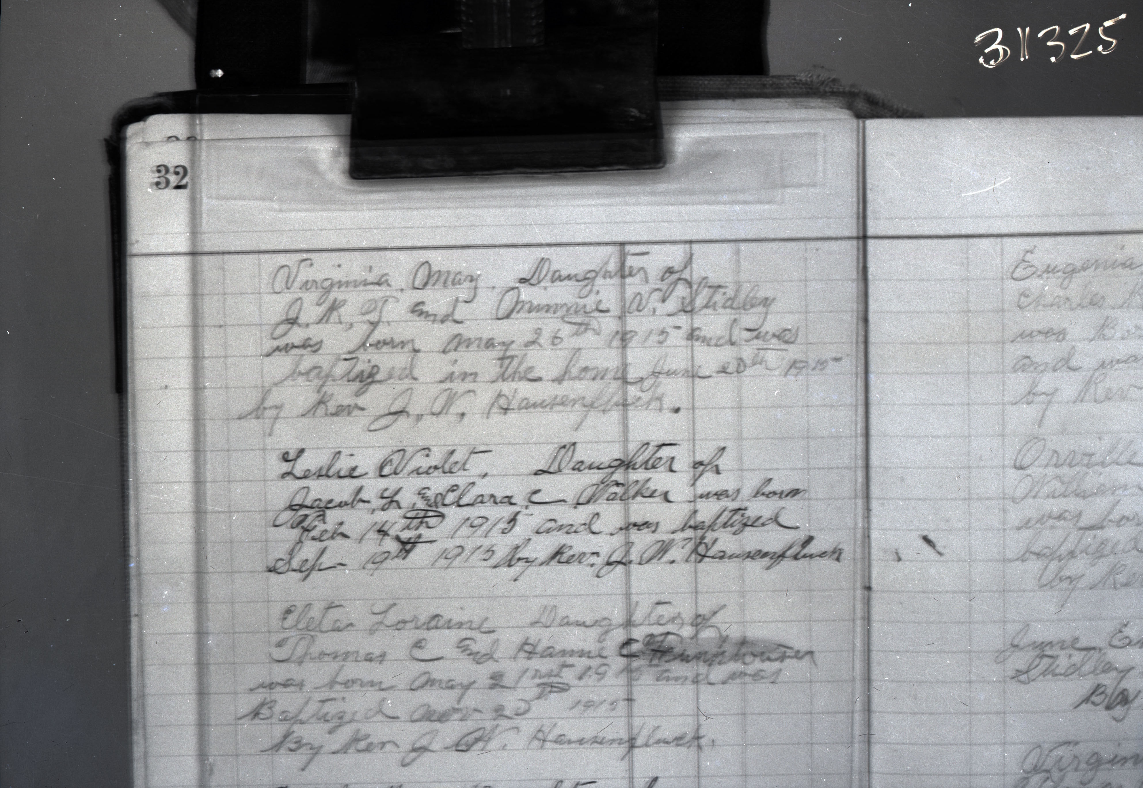 Leslie Violet, Daughter of Jacob L. and Clara C. Walker was born Feb 14th 1915 and was baptized Sep 19th 1915 by Rev. J.W. Hausenfluck.