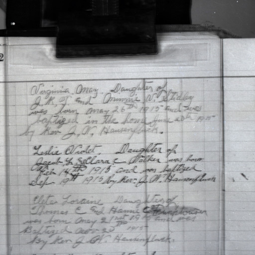 Photograph of three hand-written entries for children born and baptized in 1915 by Rev. J.W. Hausenfluck.
