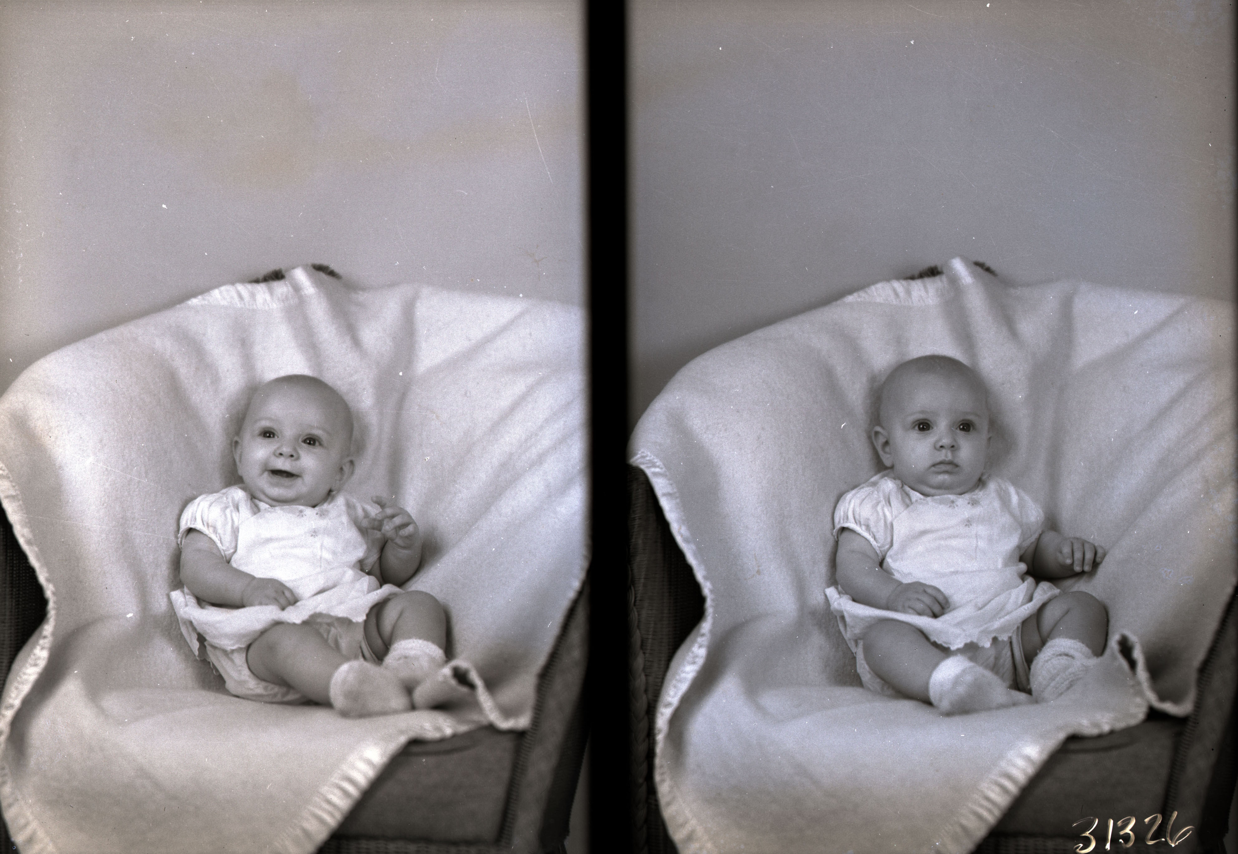 Photo of two separate photographs of the same unidentified baby posed on a blanket spread over a chair.