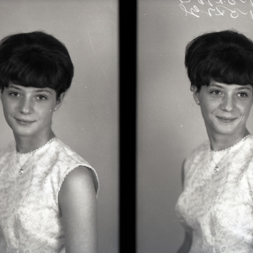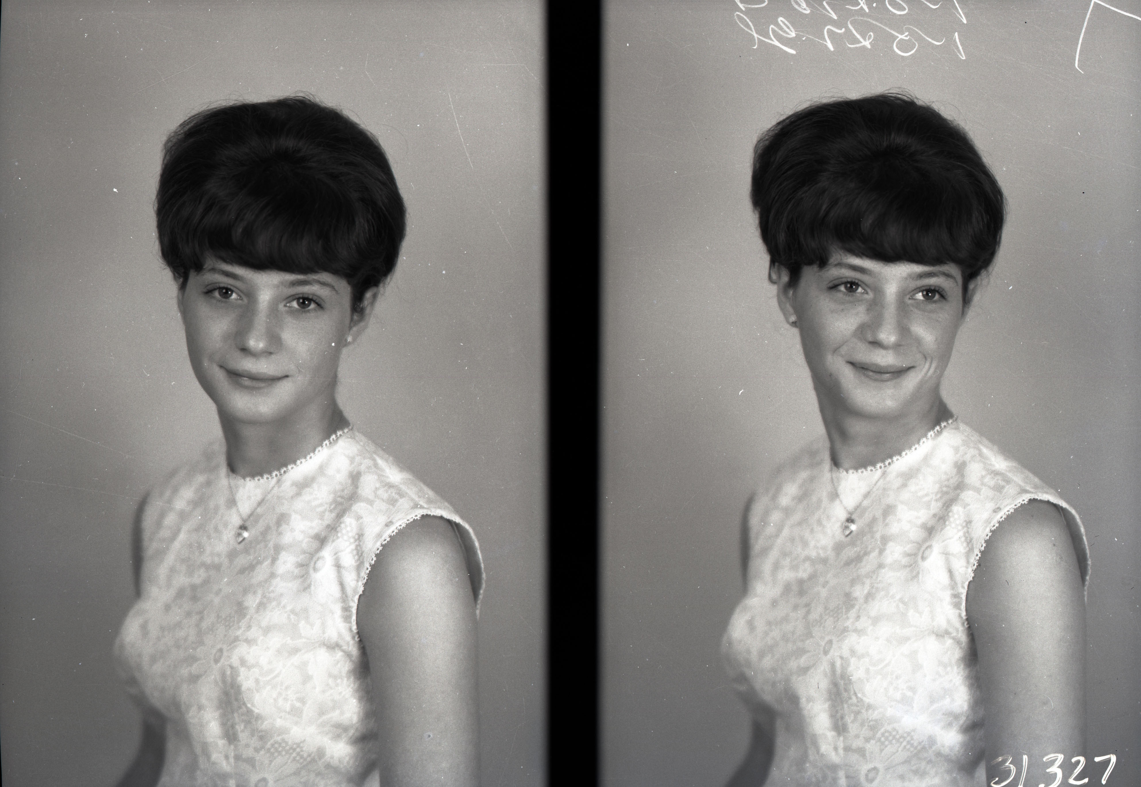 Photo of two separate portrait photographs of the same unidentified young woman with short hair and wearing a sleeveless dress.