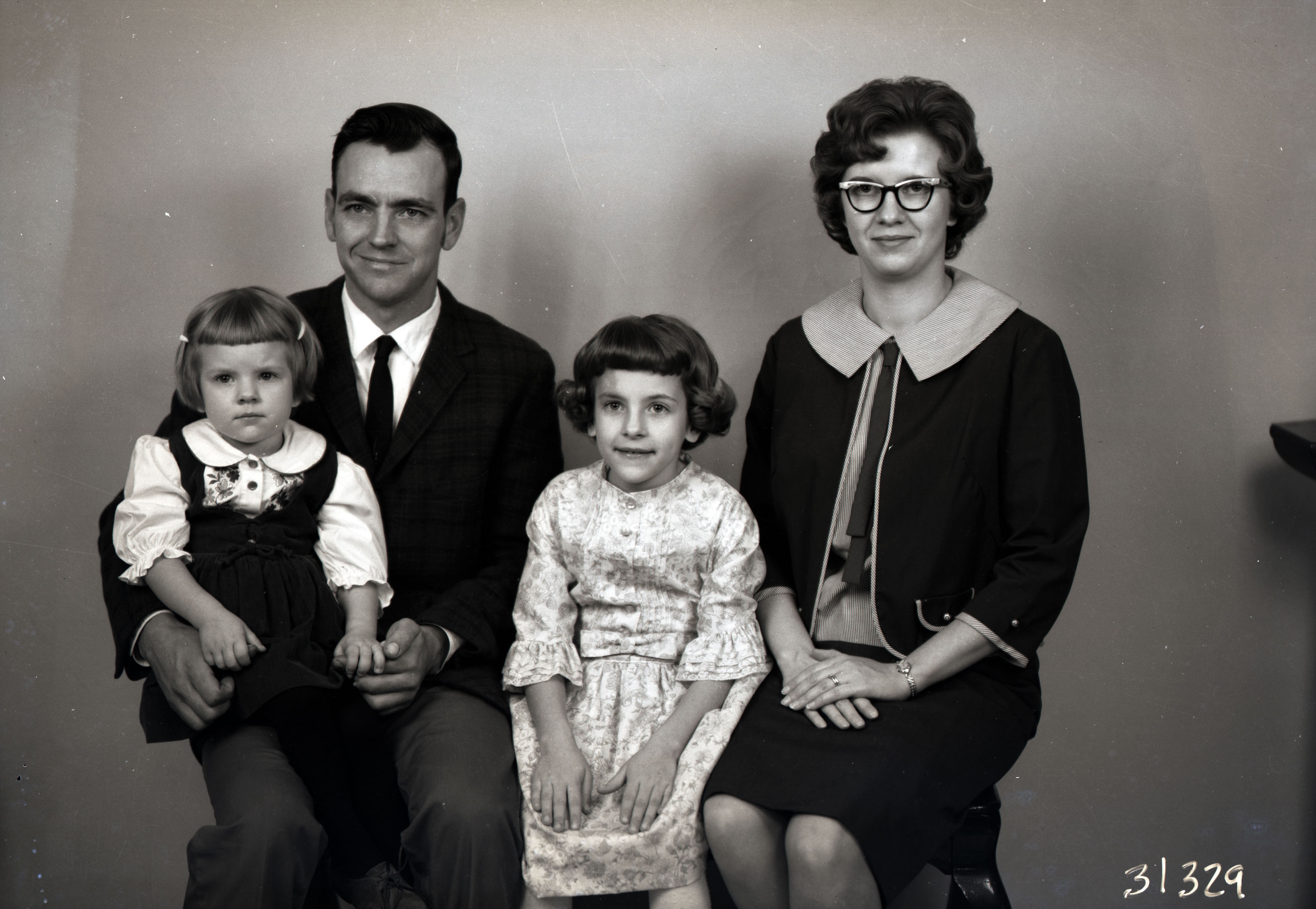 Unidentified man and woman with glasses and short hair are seated together with two unidentified young girls posed with them.