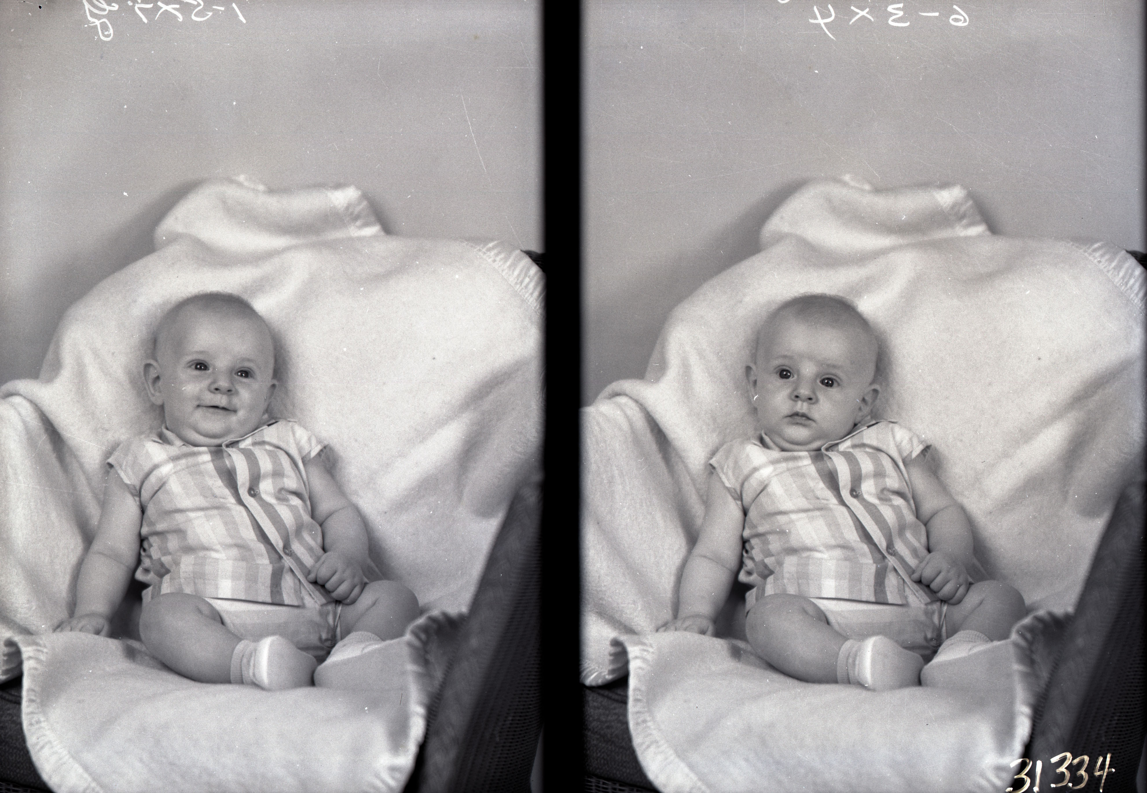 Photo of two separate photographs of the same unidentified baby in a striped outfit and posed on a covered chair.