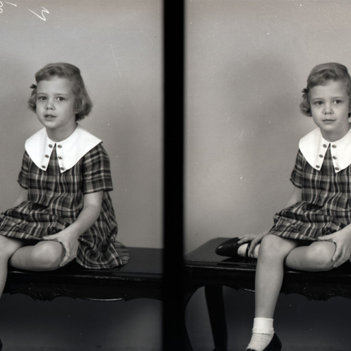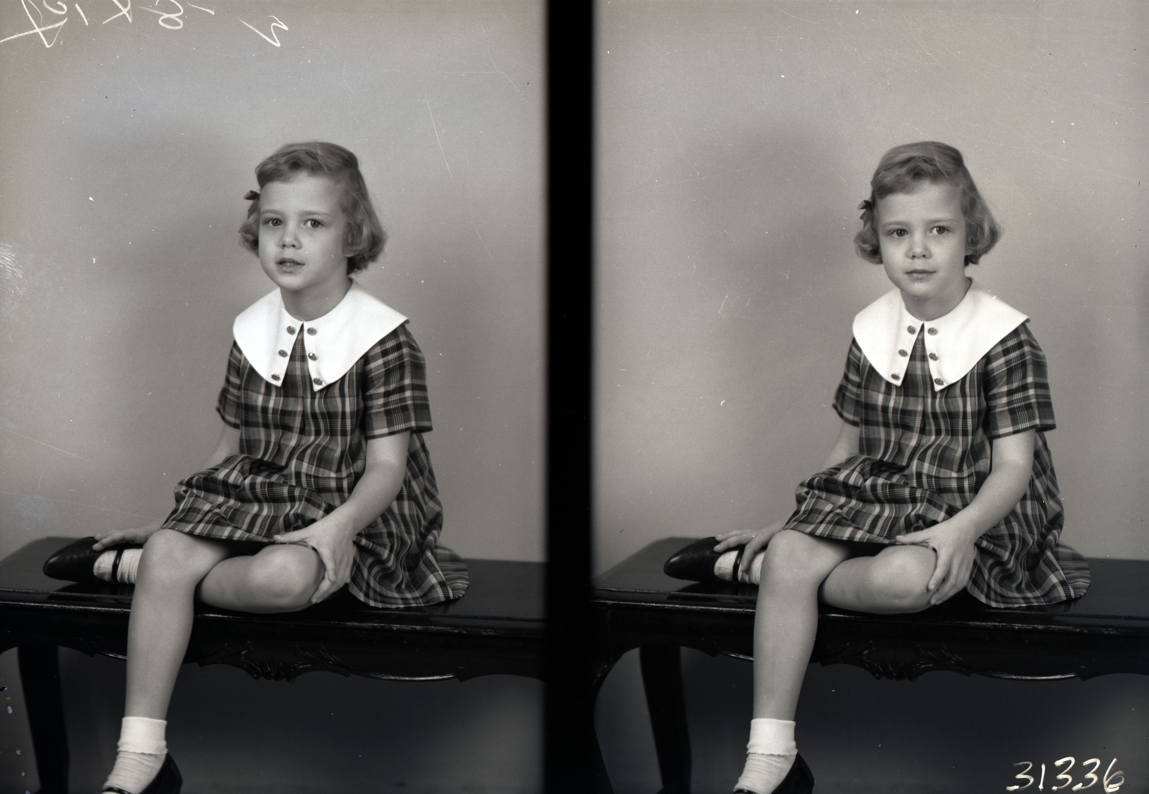 Photo of two separate photographs of the same unidentified girl with a bow in her short hair and wearing a plaid dress.