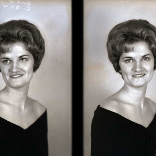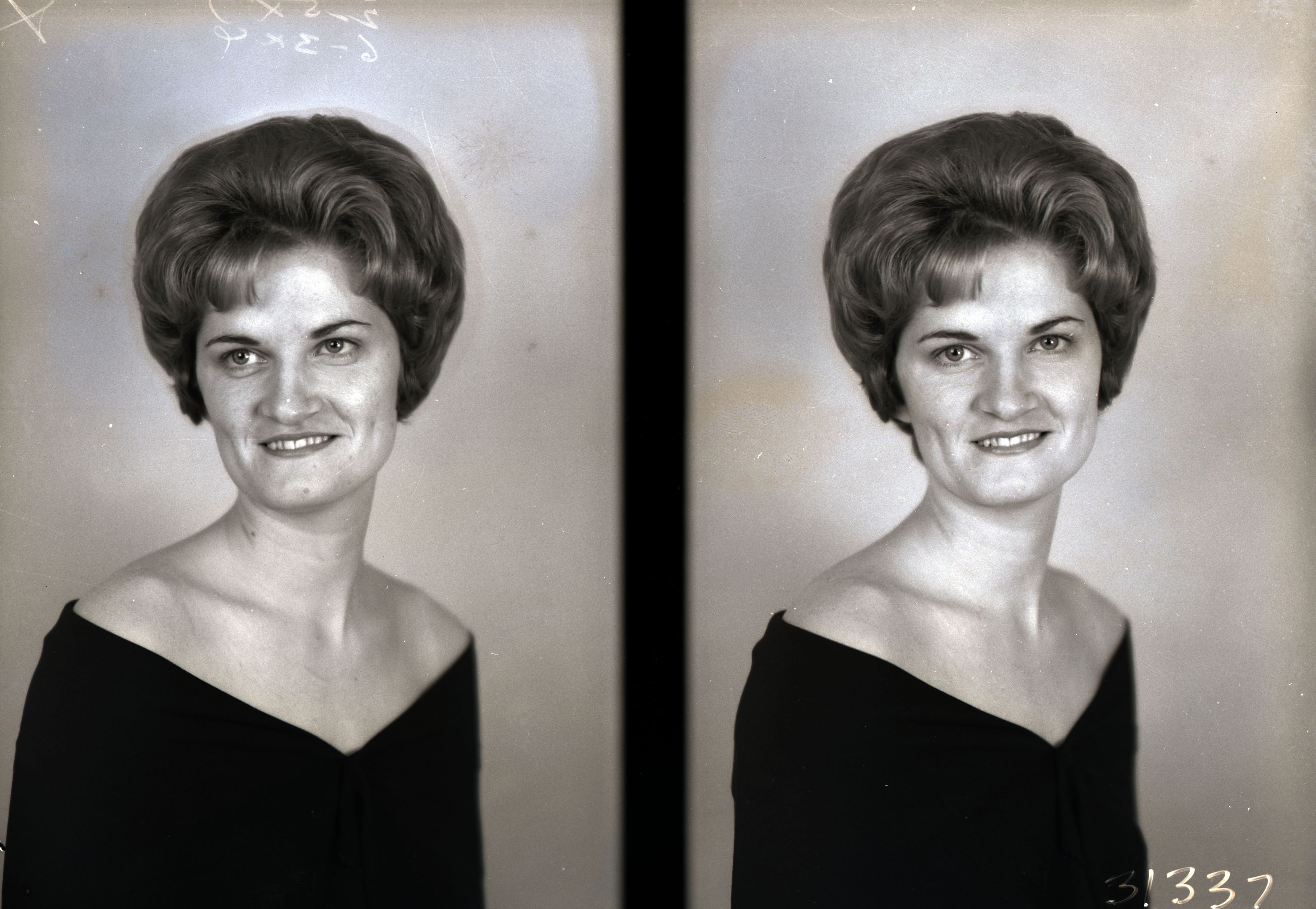 Photo of two separate portrait photographs of the same unidentified woman with short styled hair and wearing a photographer's drape.