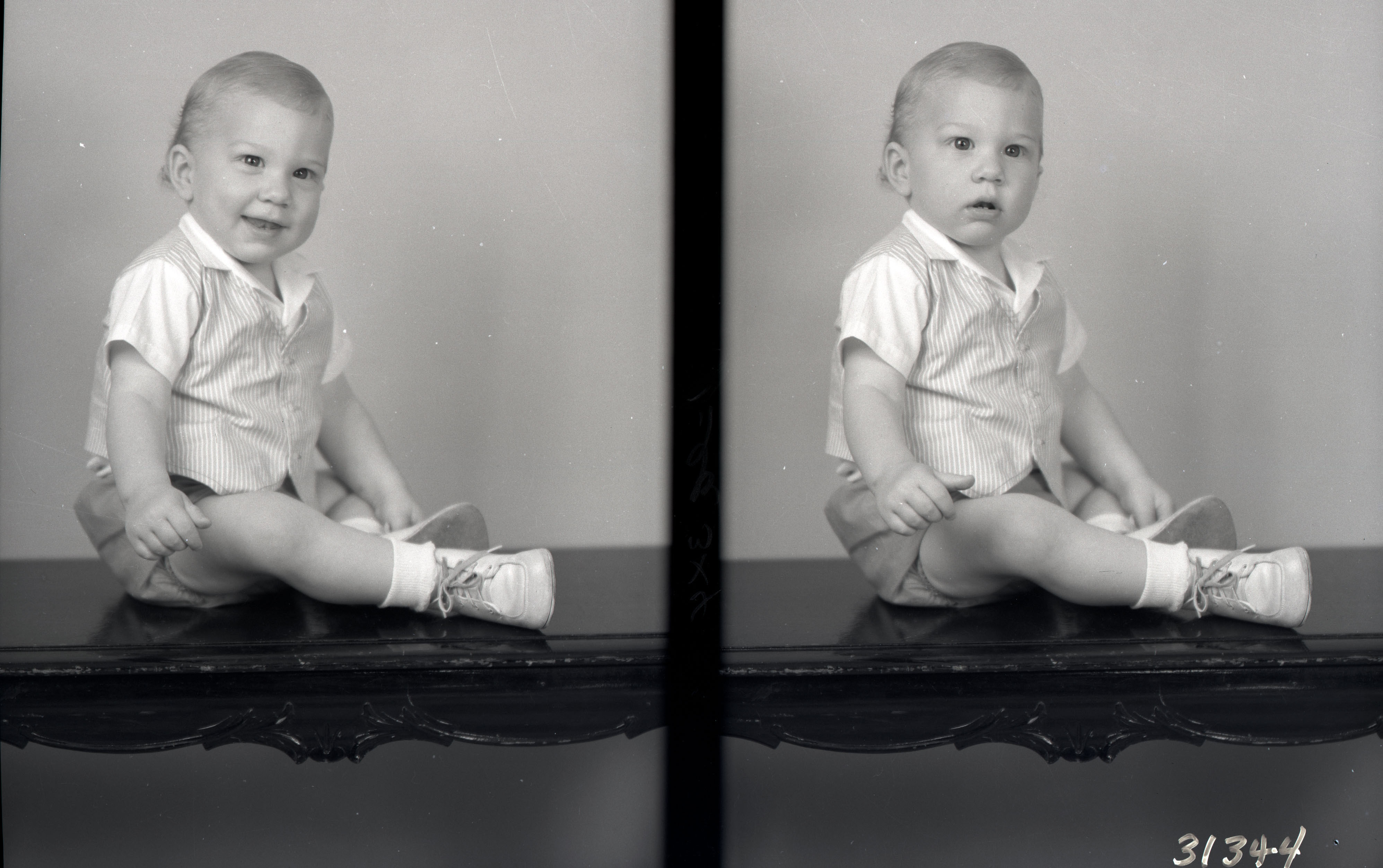 Photo of two separate photographs of the same unidentified young boy seated on a bench and wearing a striped vest and shorts.