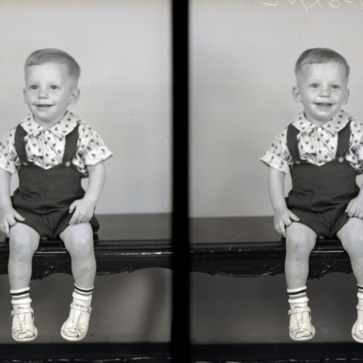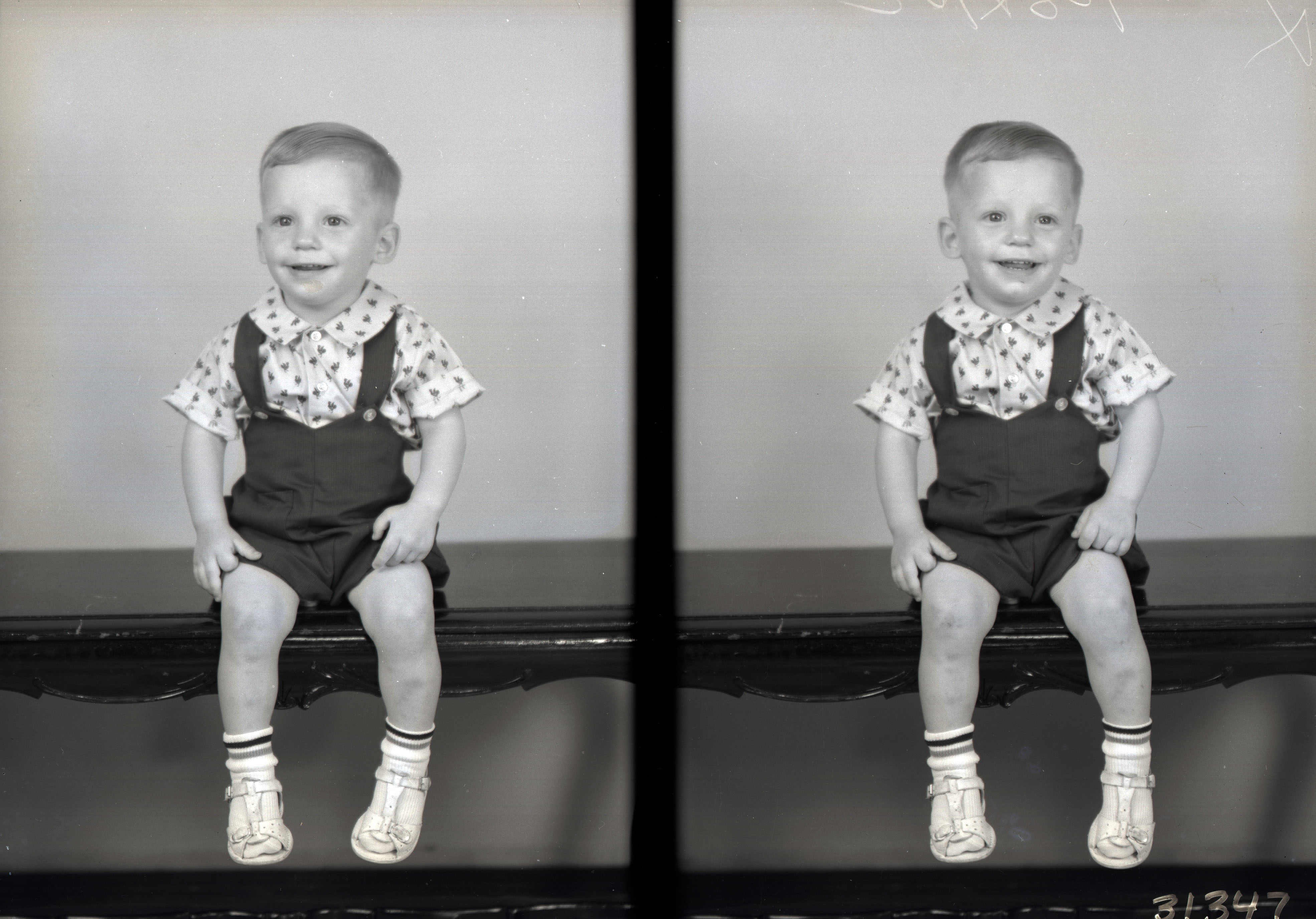 Photo of two separate photographs of the same unidentified young boy seated on the edge of a bench and wearing shorts, suspenders, and a short-sleeved print shirt.