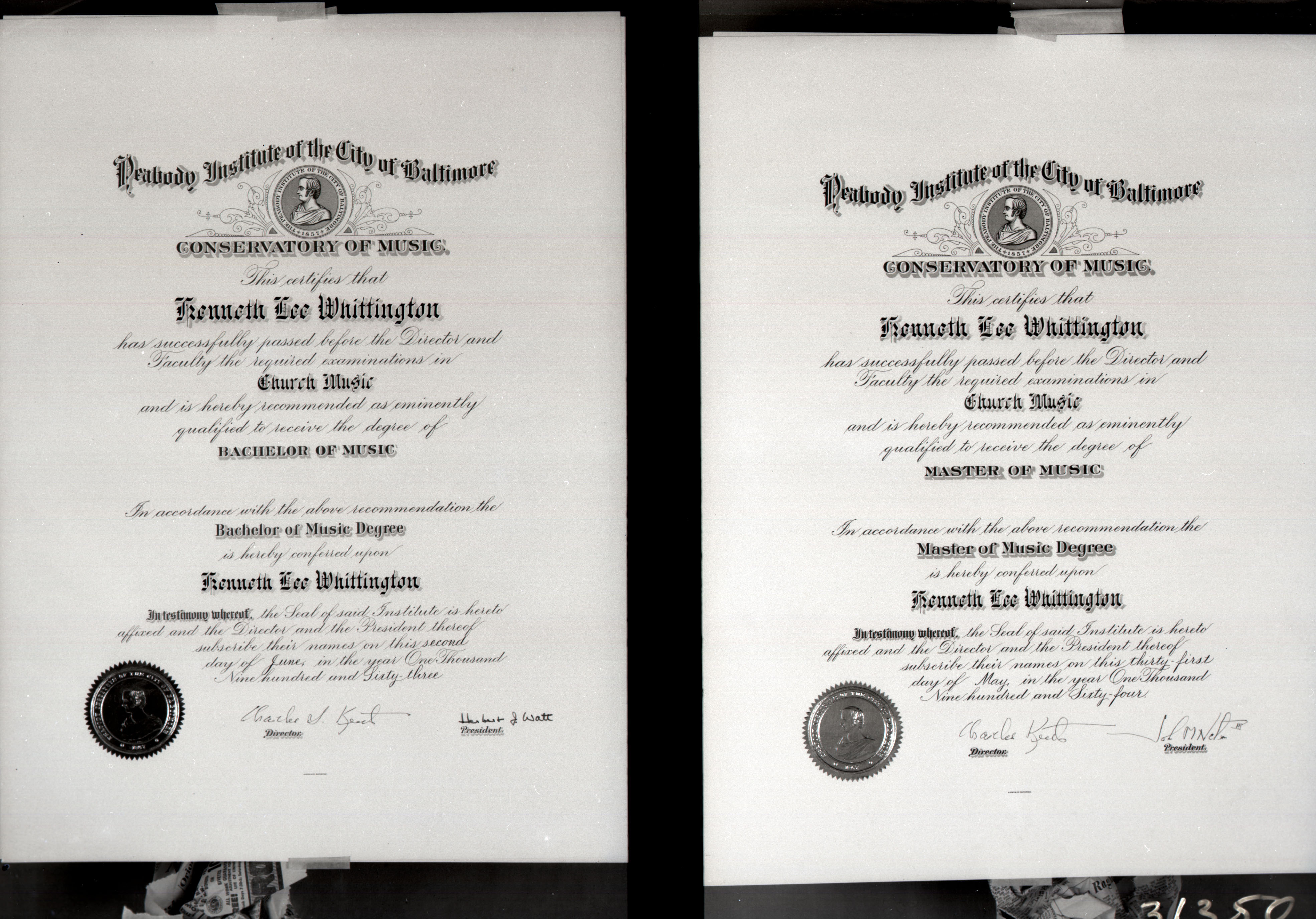 On the right is a Masters Degree in Church Music awarded by the Peabody Institute of Music in Baltimore, Maryland, dated 1964.