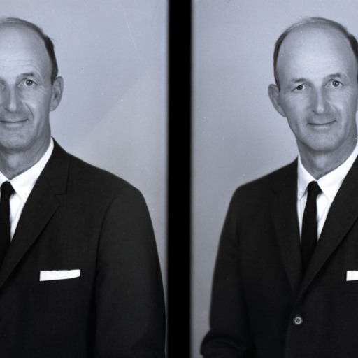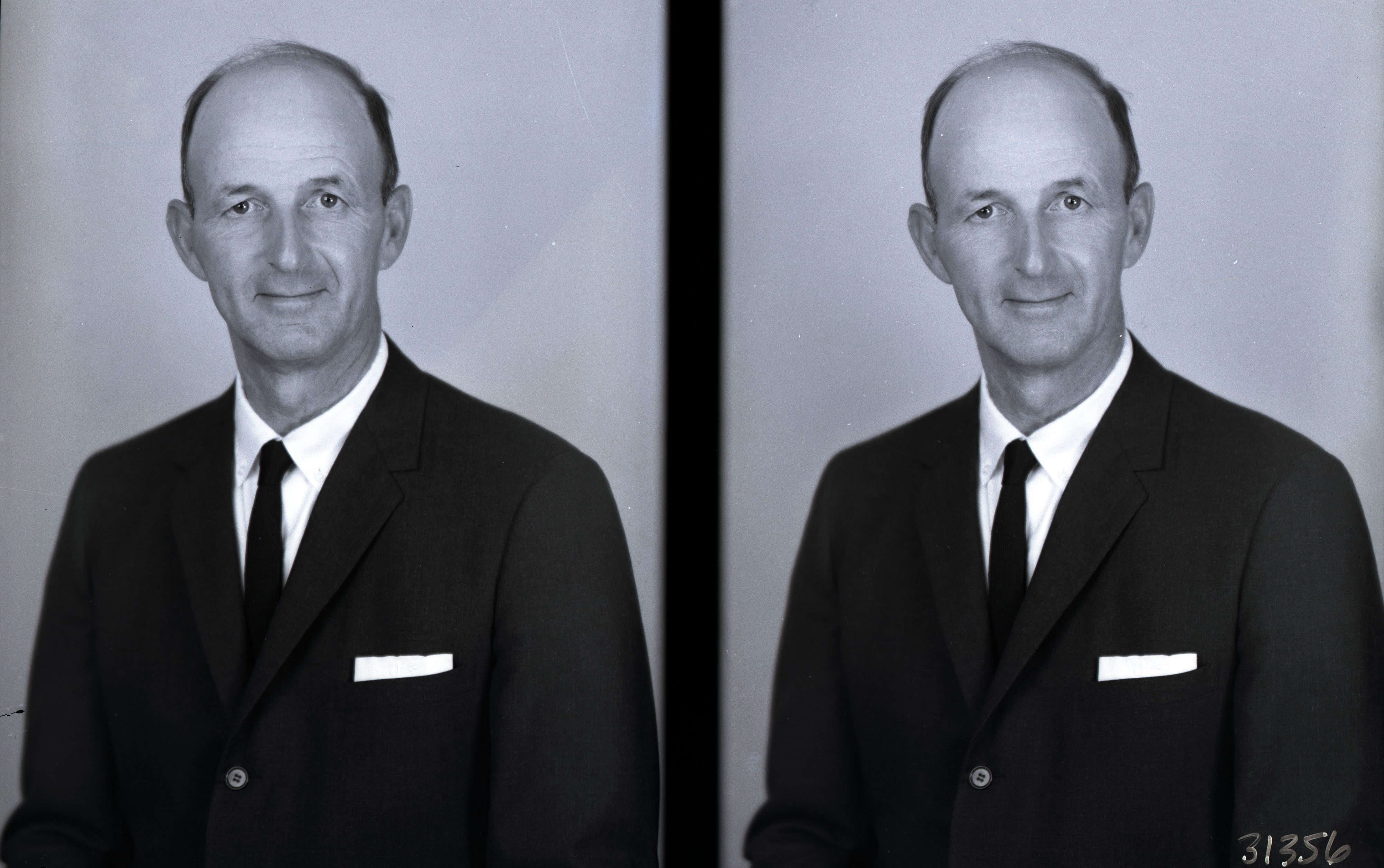 Photo of two separate portrait photographs of Joe Myers wearing a suit and tie.