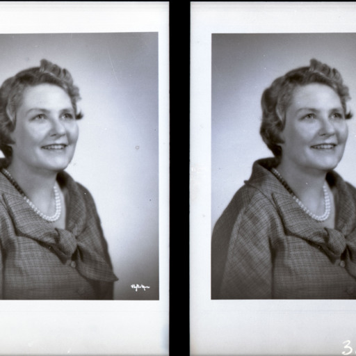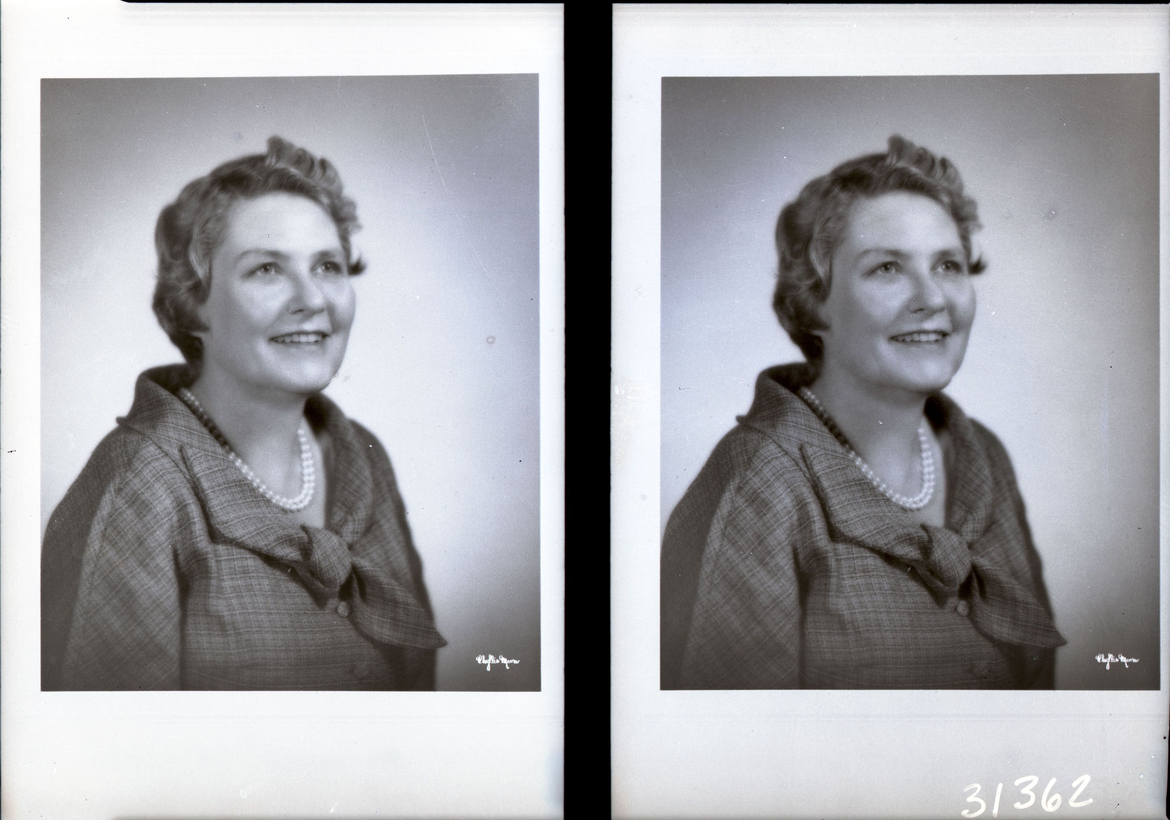 Photo of two separate portrait photographs of the sme unidentified woman with short hair and wearing a dress with a bow in the front.