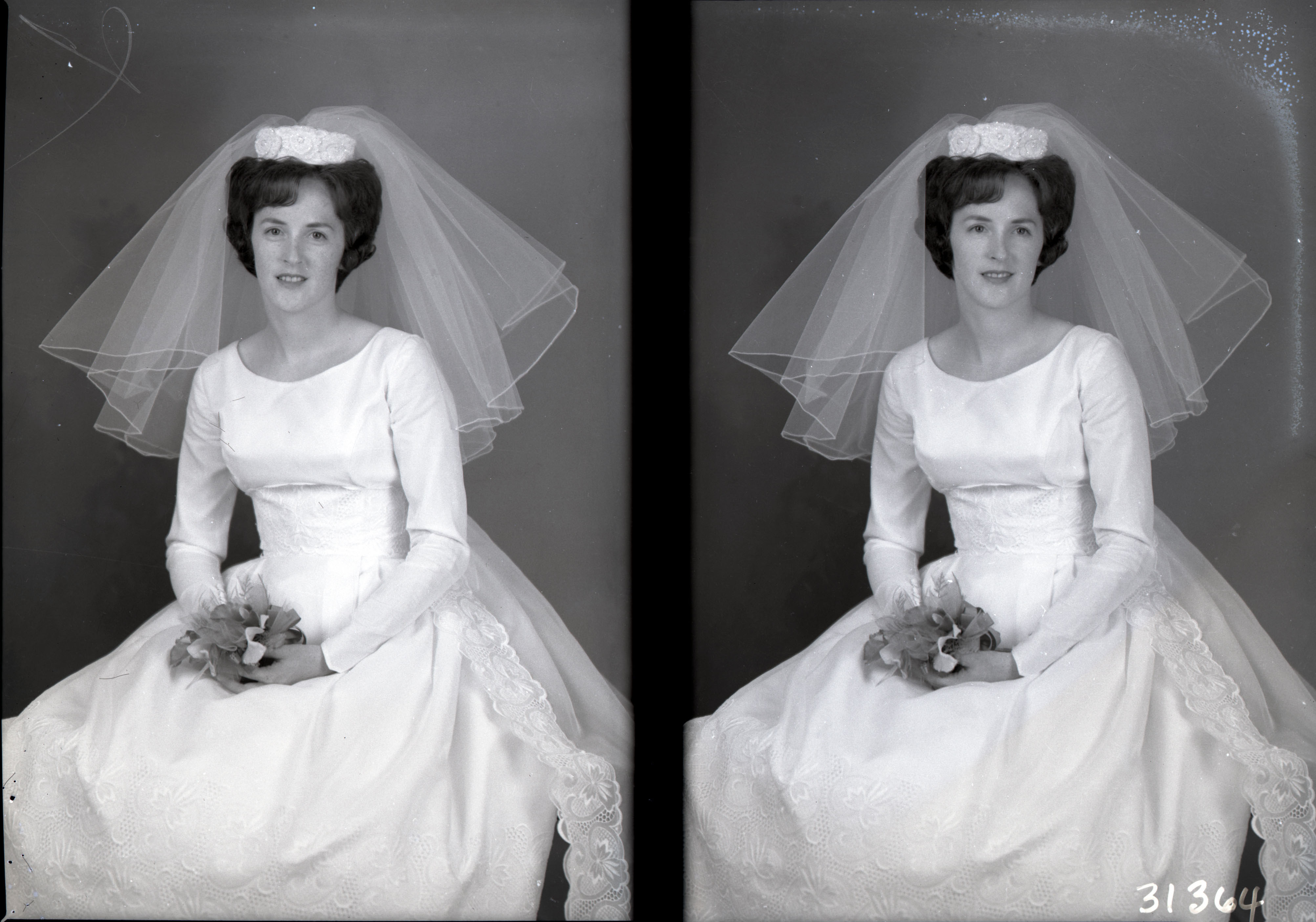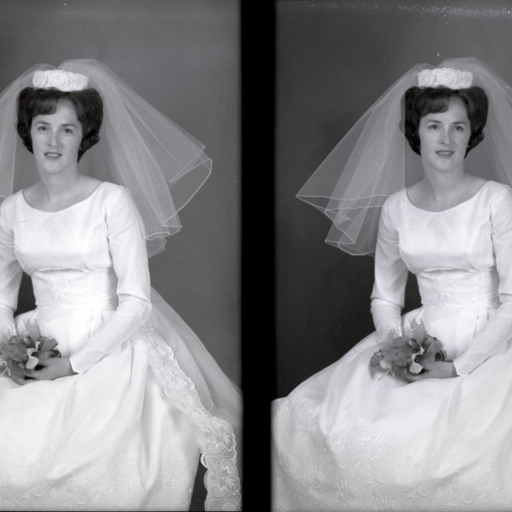 Photo of two separate photographs of Barbara Miller Marston Hollar as a bride in her wedding dress, veil, and holding a bouquet.