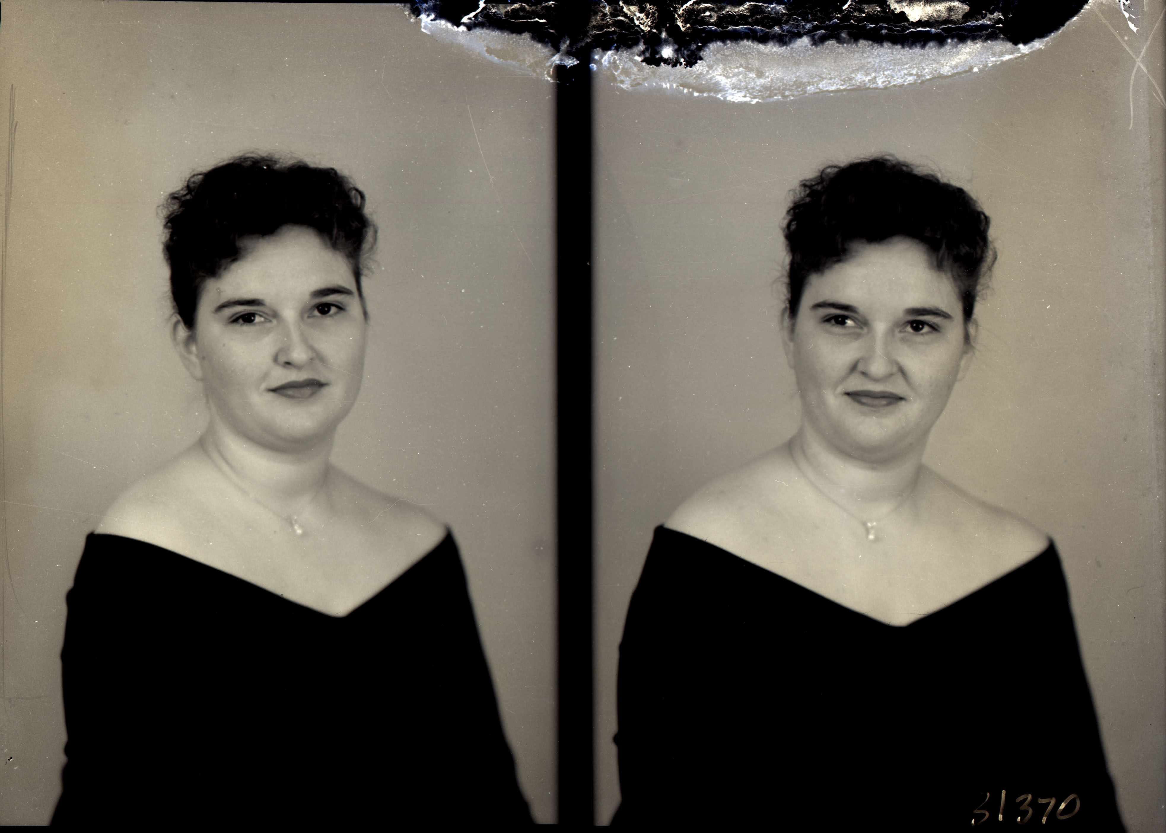 Photo of two separate portrait photographs of Alice Sandra (Ritenour) Poe as a young woman with her hair pulled up and wearing a photographer's drape.