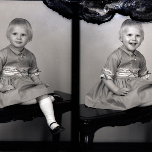 Photo of two separate photographs of the same unidentified girl with short blond hair. She is seated on a bench with one leg under the other.