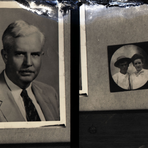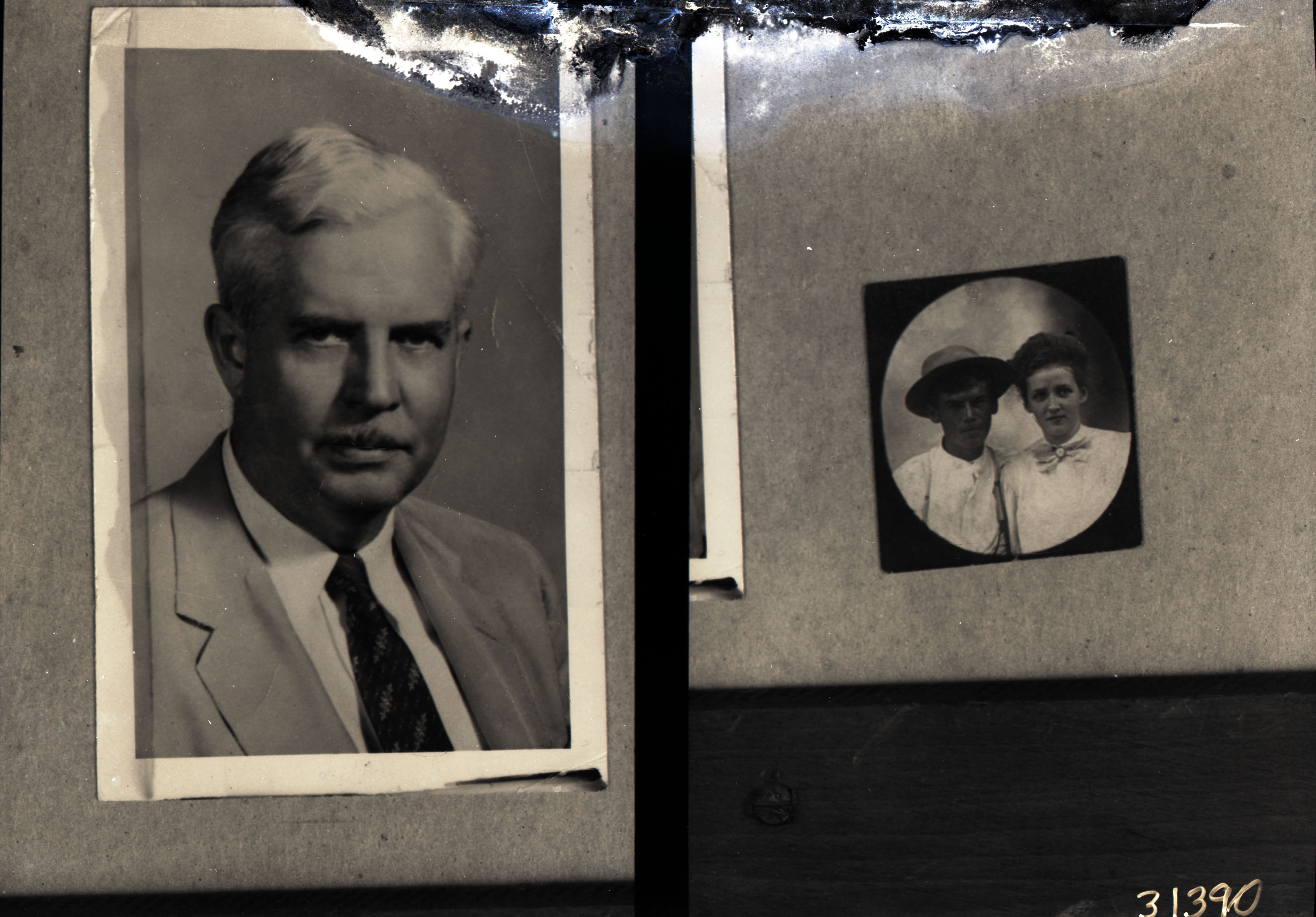 On the right is a round-framed portrait photograph of an unidentified couple with the man wearing a hat.