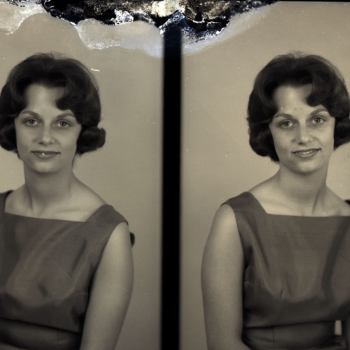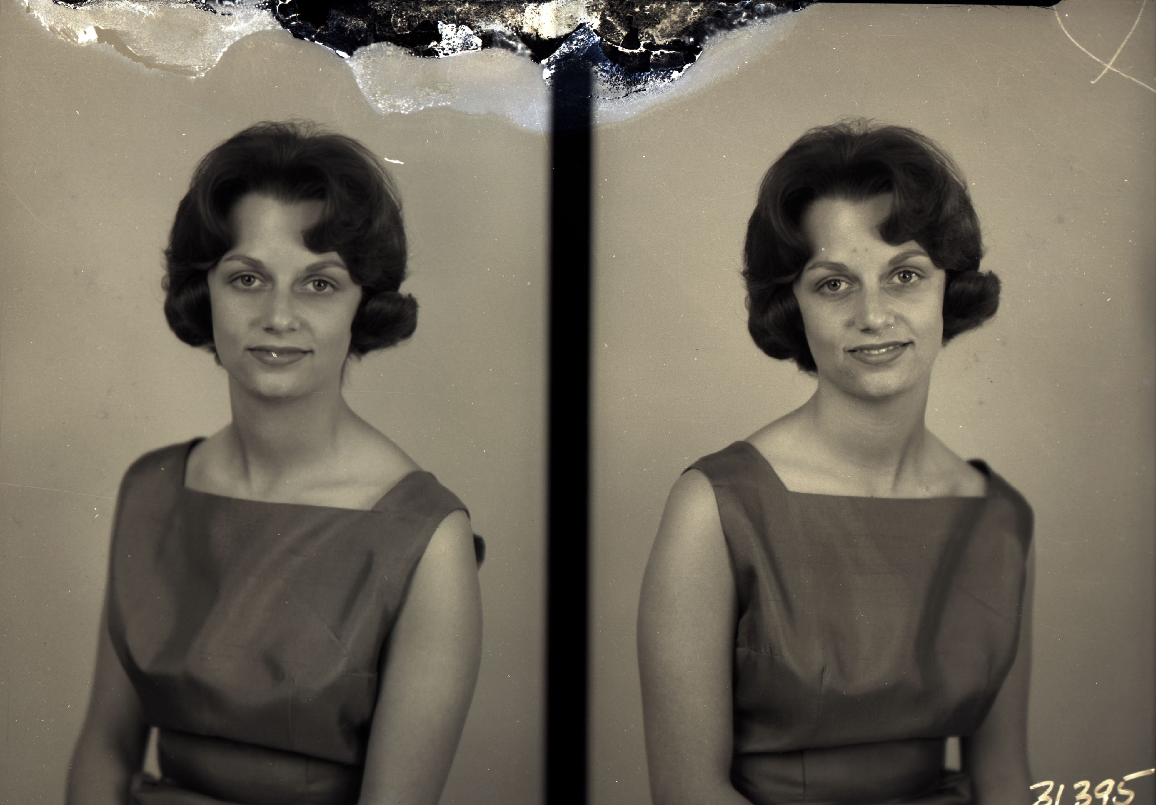 Photo of two separate portrait photographs of Helen Melissa (Chapman) Marks wearing a sleeveless dress.