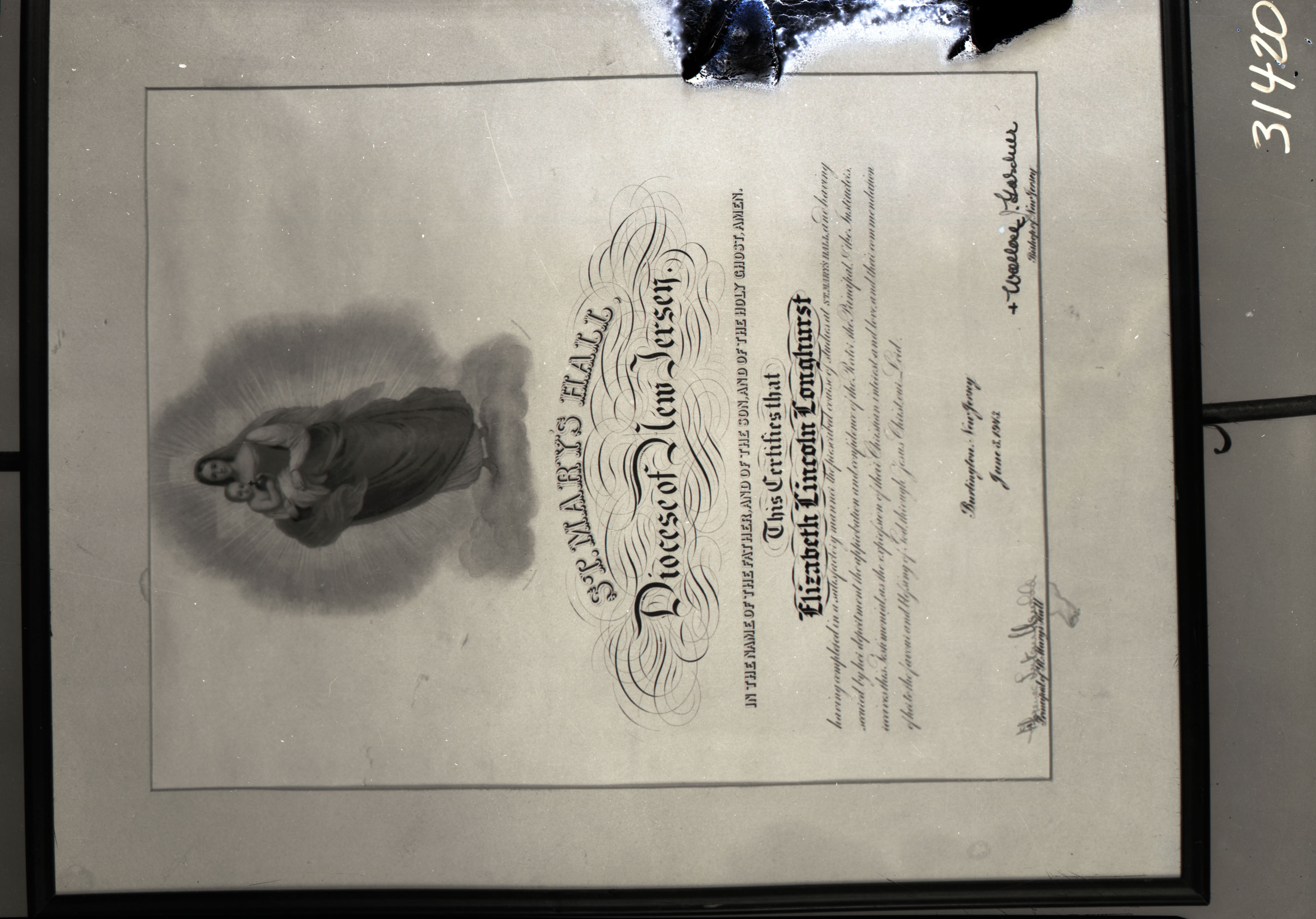 Photograph of the certificate issued by St. Marys Hall in Burlington, New Jersey, to Elizabeth Lincoln Longhurst, in June 1943, to commemorate her successful completion of the requisite course of studies there.