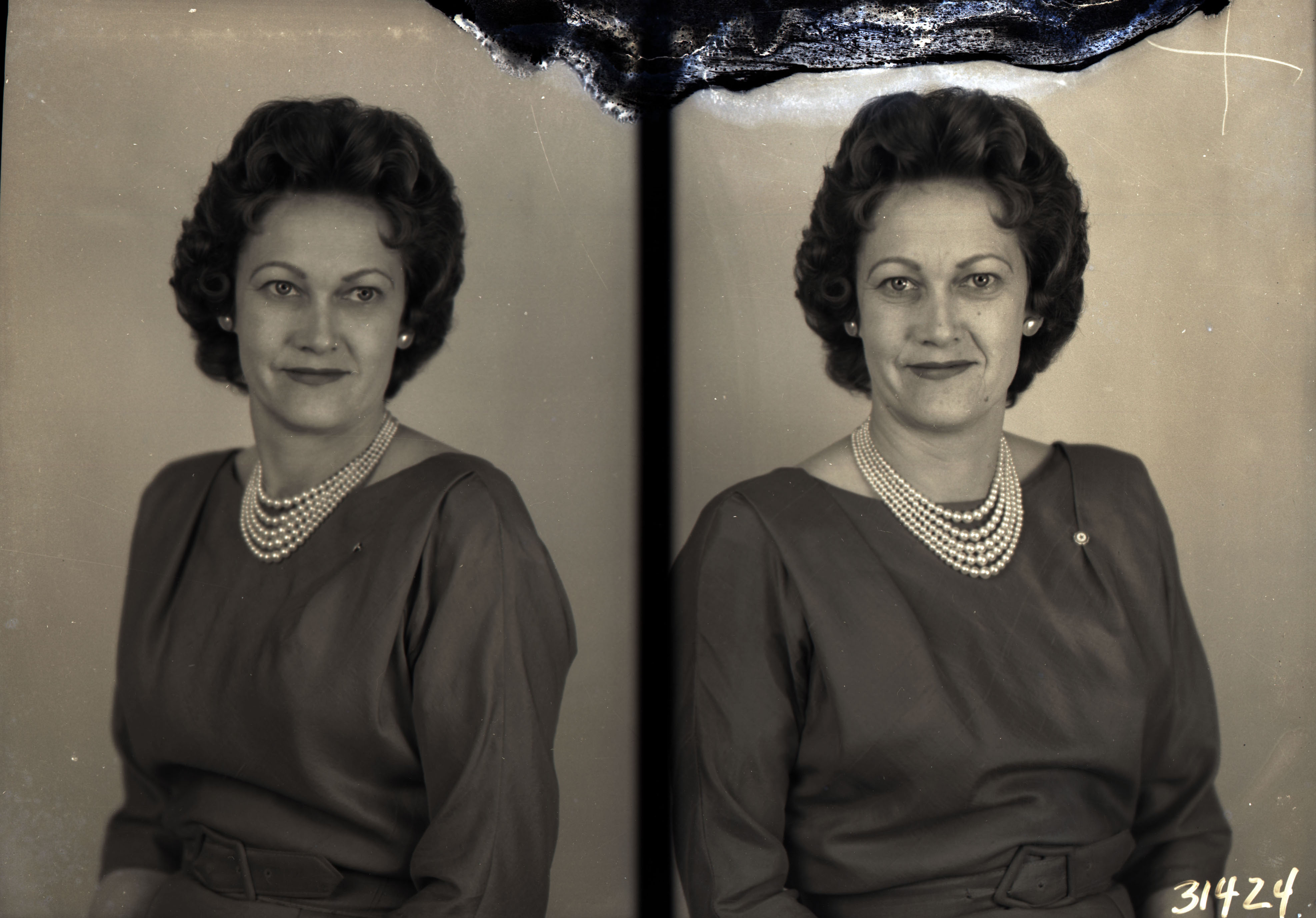 Photo of two separate portrait photographs of Betty (Cook) Good with short styled hair and wearing a necklace and earrings with her dress.