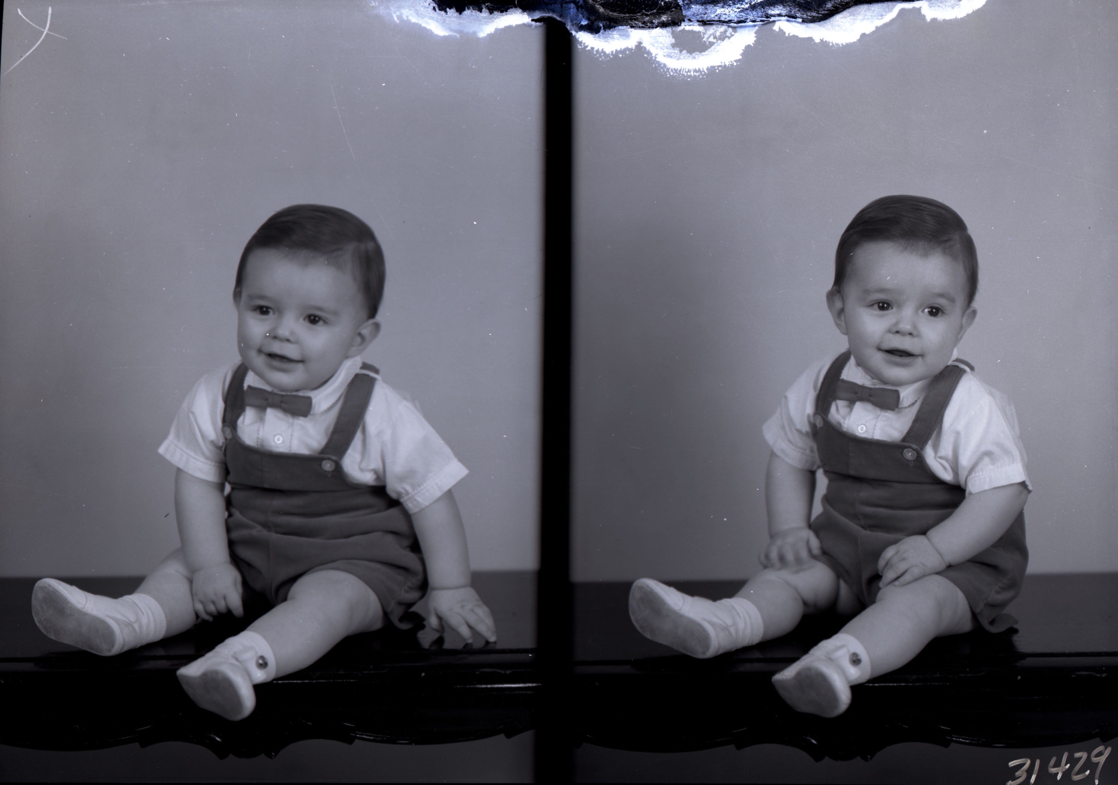 Photo of two separate photographs of the same unidentified young boy wearing a bow tie and seated on a bench.