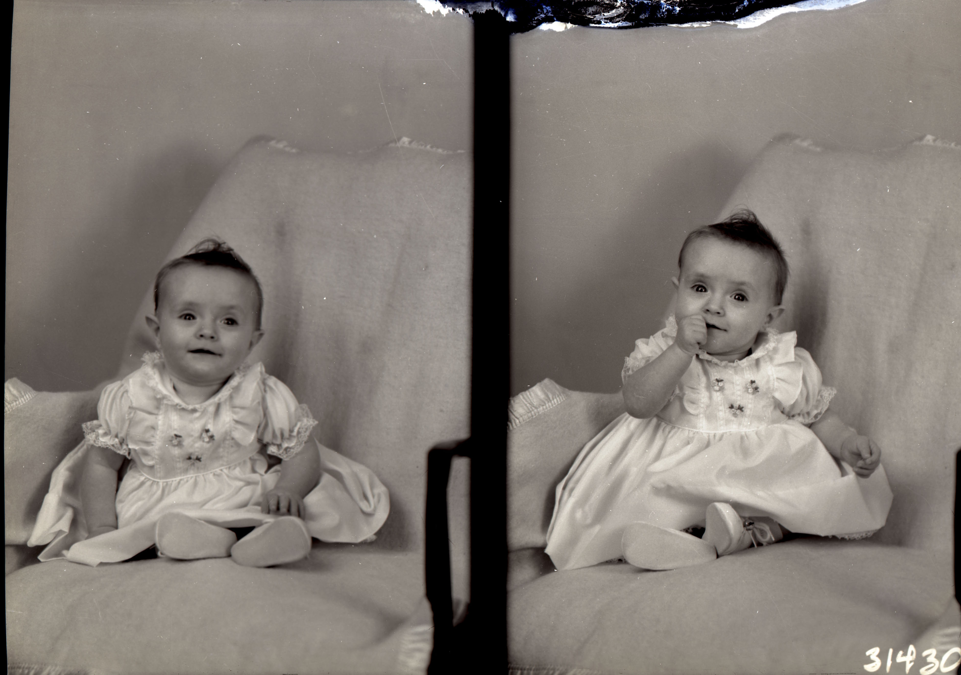 Photo of two separate photographs of the same unidentified young child seated on a covered surface.