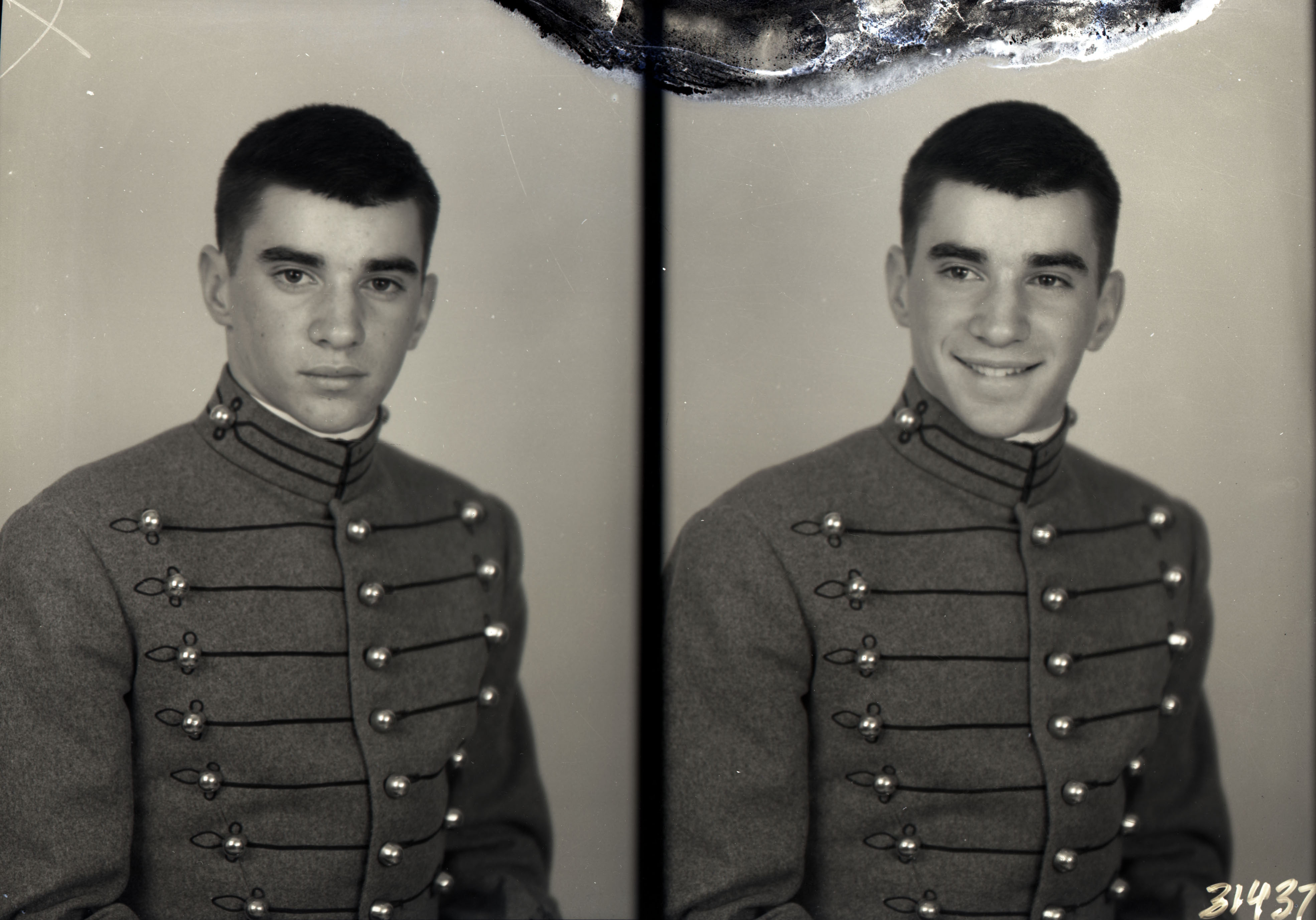 Photo of two portrait photographs of Billy Allen as a young cadet in his Massanutten Military Academy (MMA) uniform.