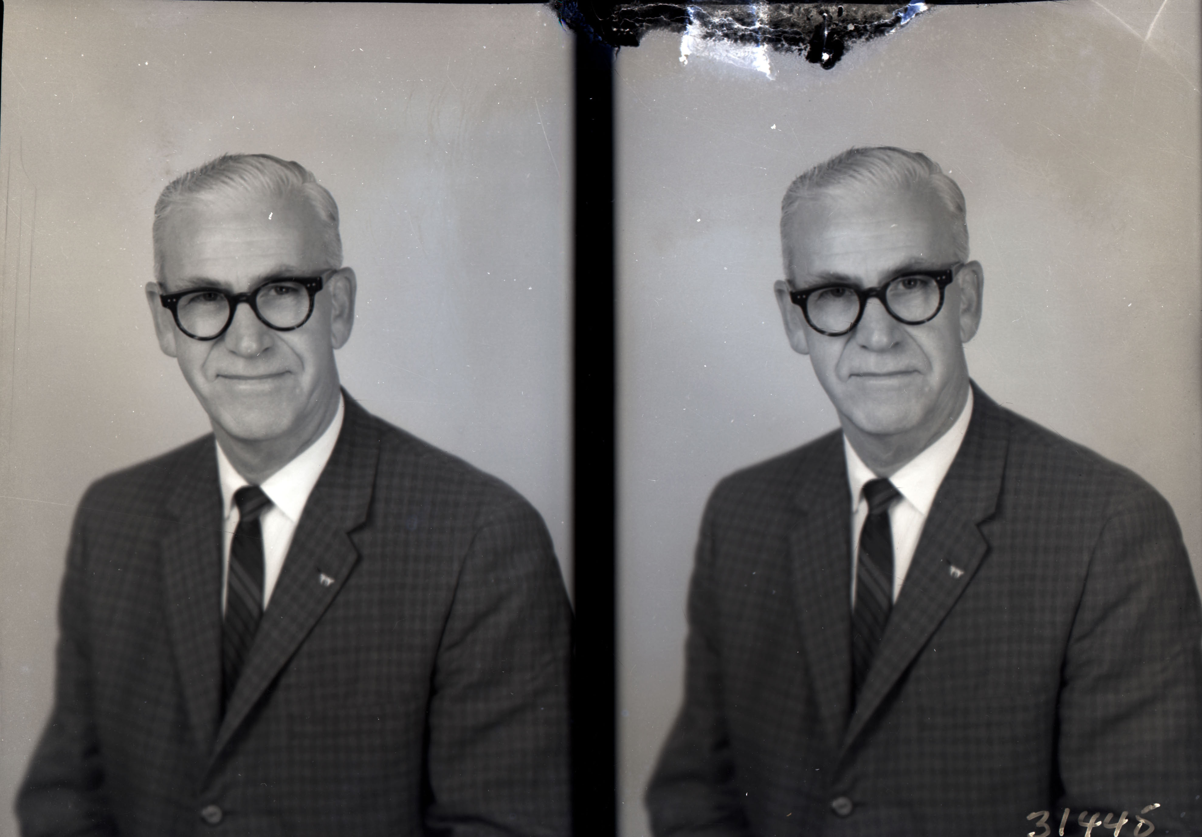 Photo of two separate portrait photographs of the same unidentified man with glasses and wearing a suit and tie.