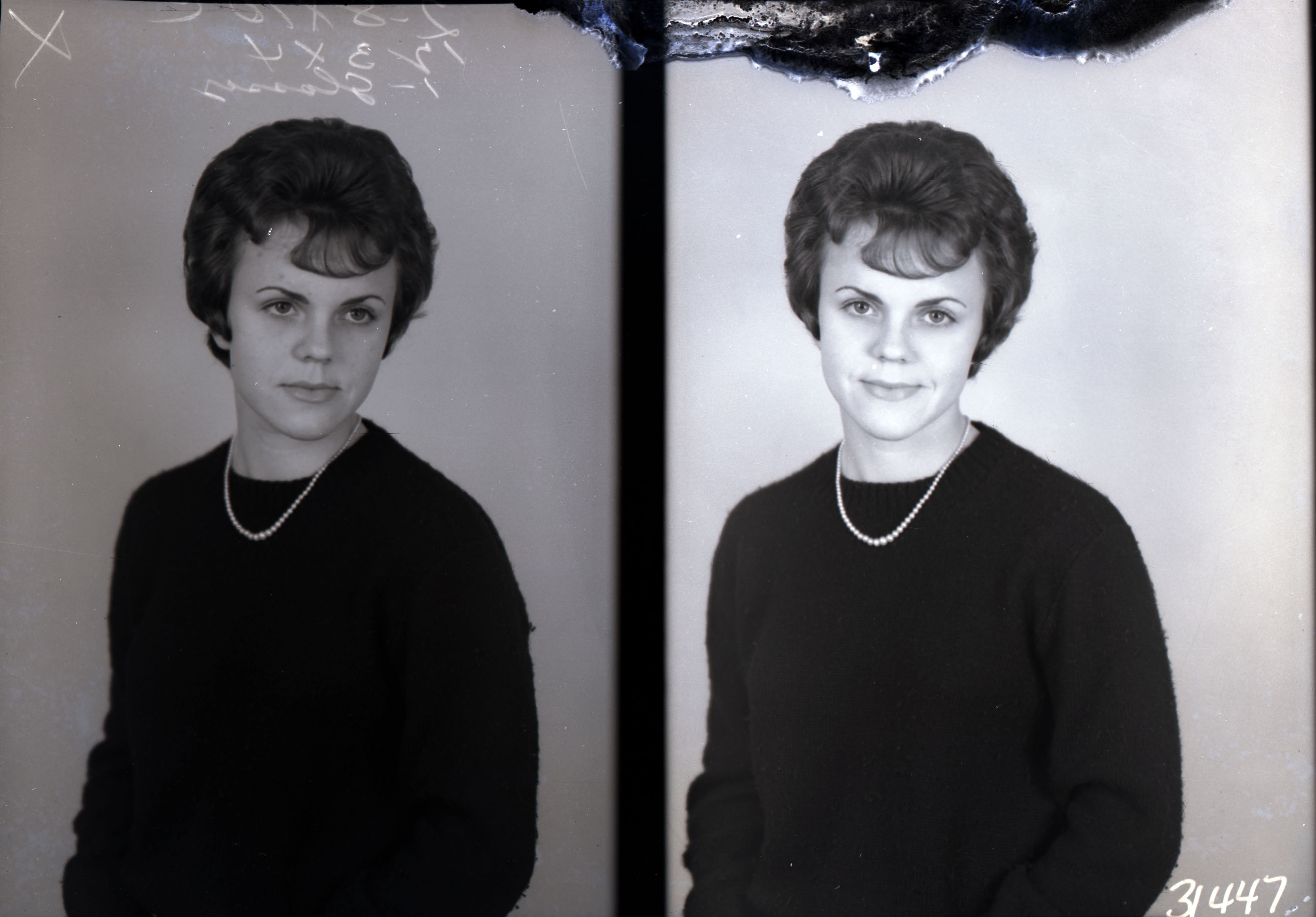 Photo of two separate portrait photographs of the same unidentified woman with short, styled hair and wearing a faux pearl necklace.