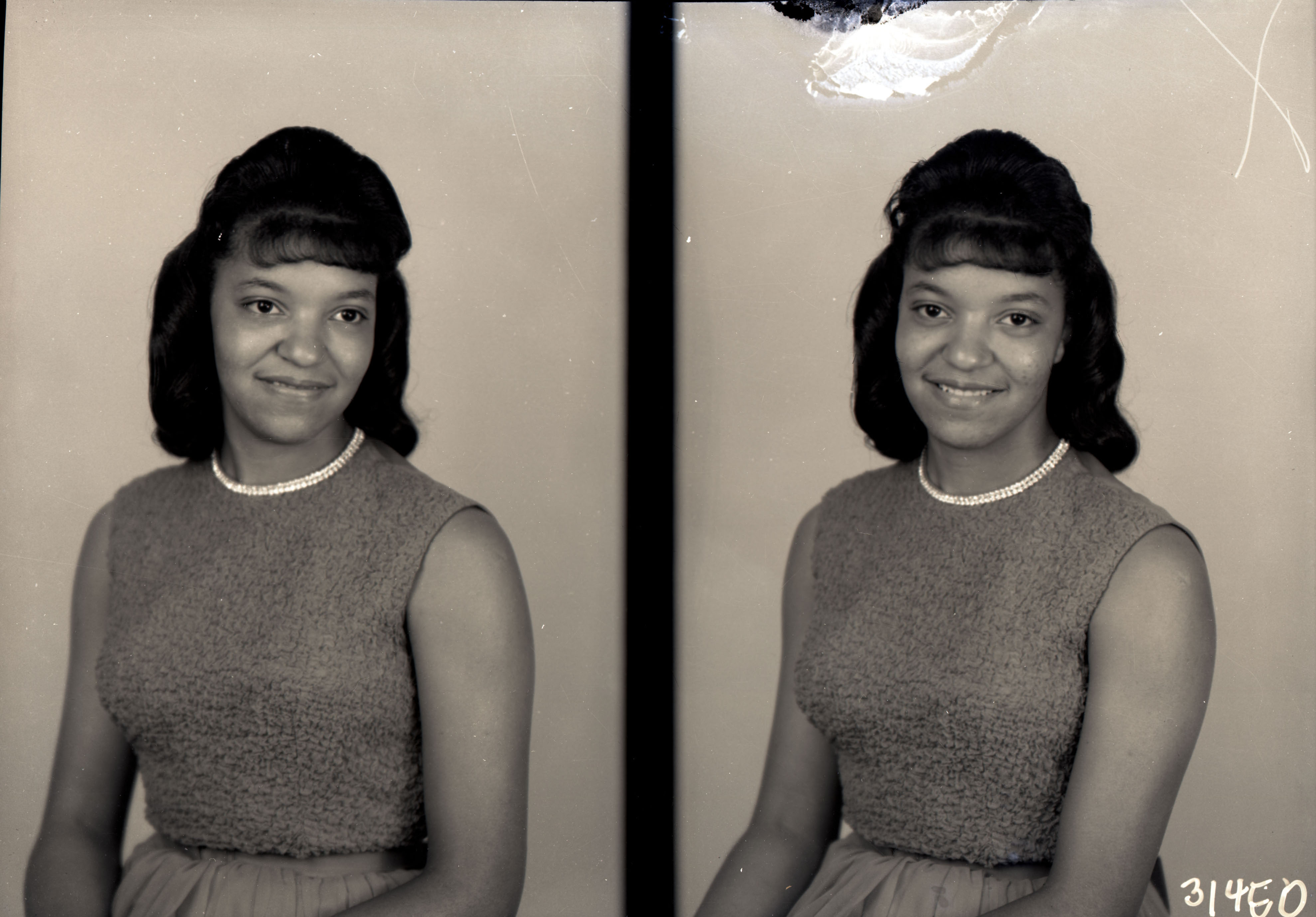 Photo of two separate portrait photographs of Gwendolyn (Tolliver) Nickens as a young woman.