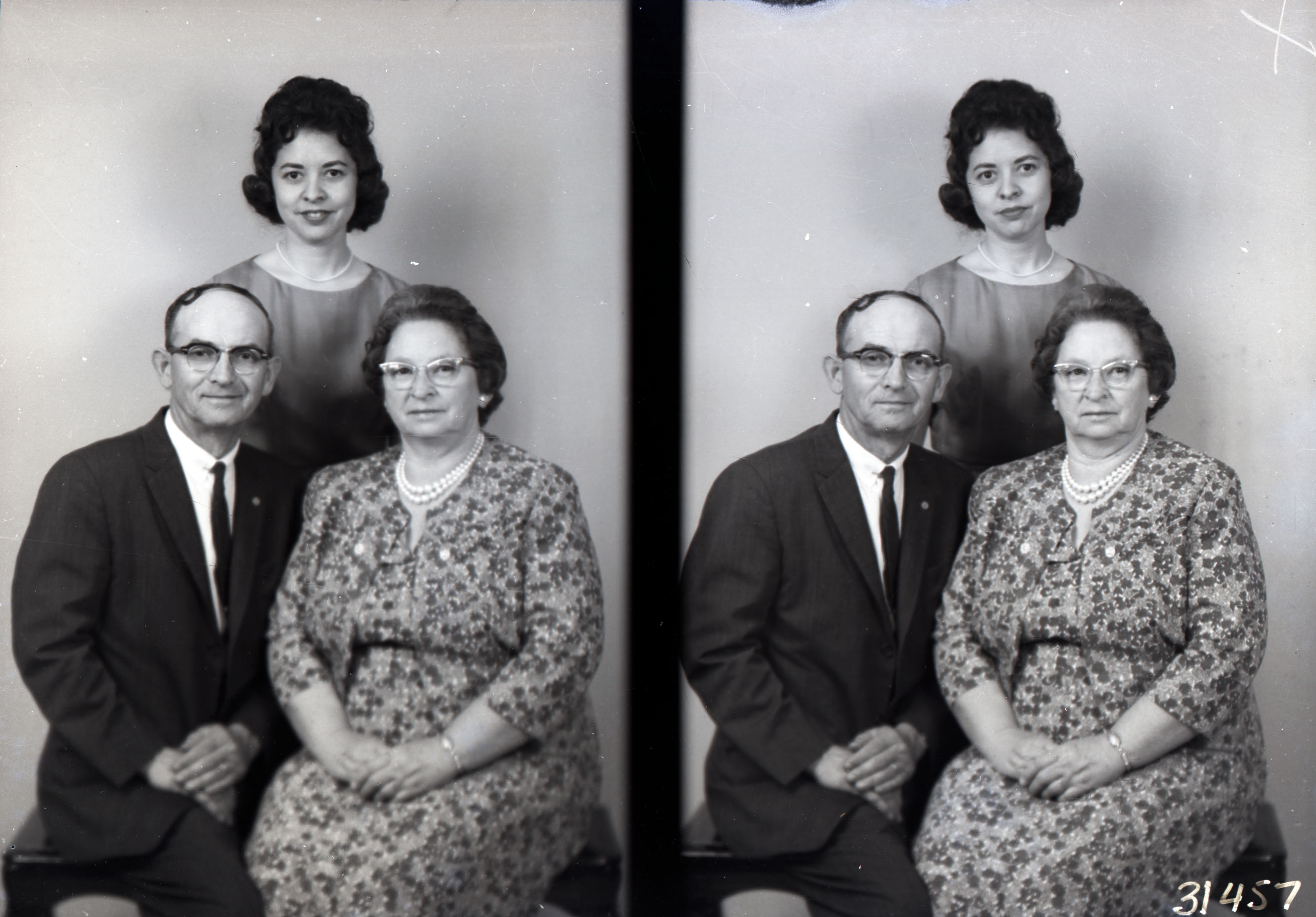 Photo of two separate photographs of the same unidentified man and woman seated together with another unidentified young woman standing behind them.