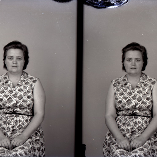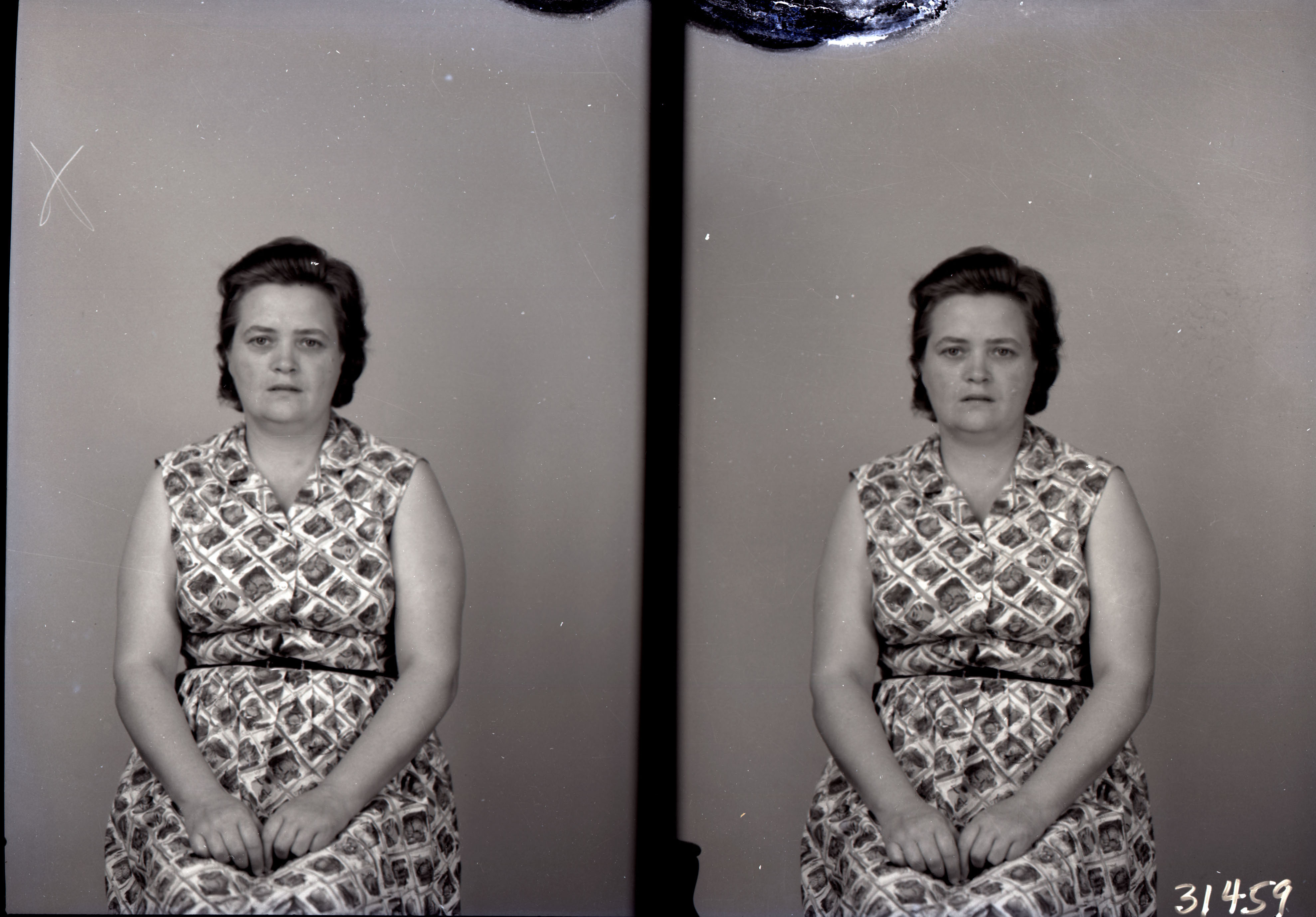 Photo of two separate photographs of the same unidentified woman with short hair and wearing a sleeveless, print dress.