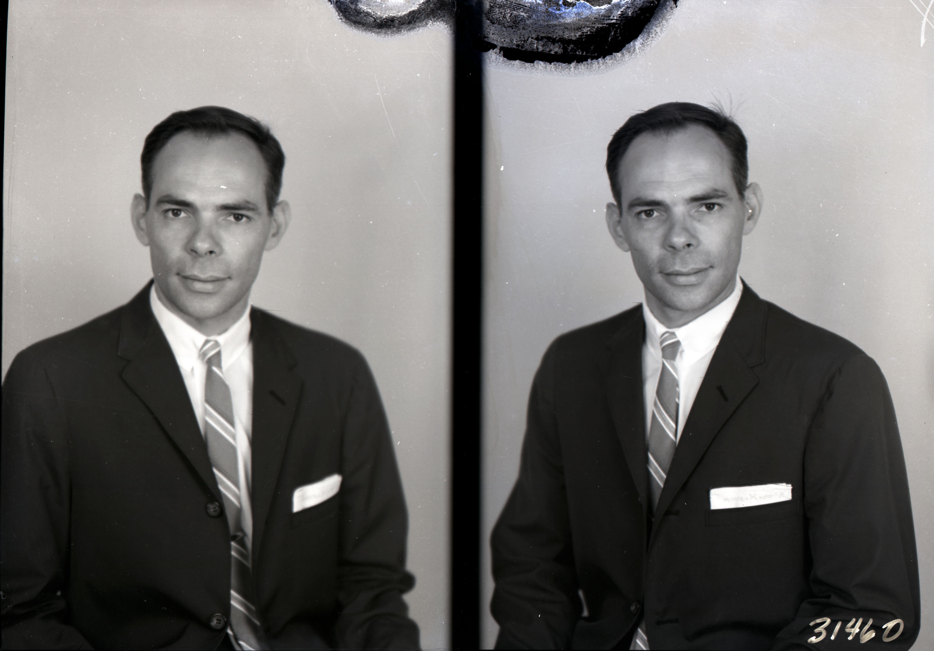 Photo of two separate portrait photographs of Kermit Racey, Sr. wearing a suit and striped tie. A handkerchief is also visible in his breast pocket.