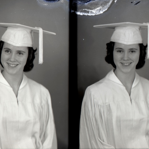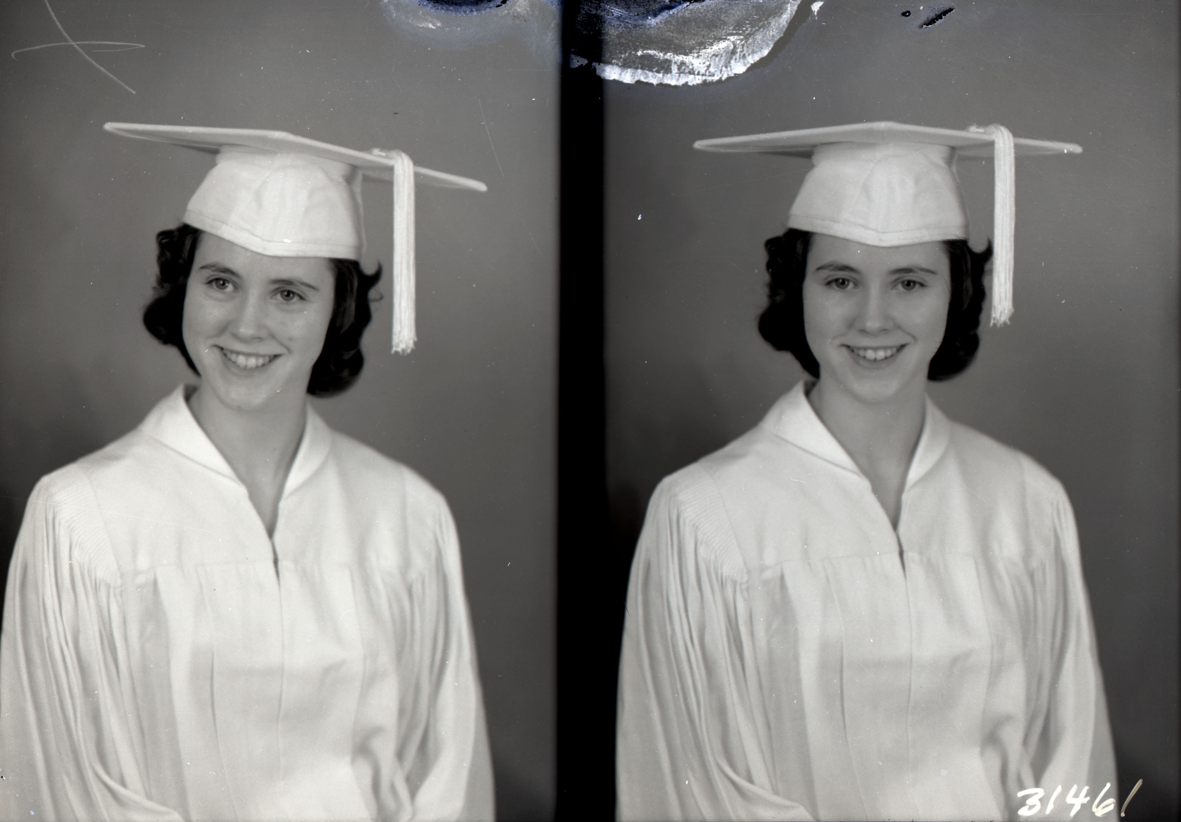 Photo of two separate portrait photographs of the same unidentified young woman in her graduation cap and gown.