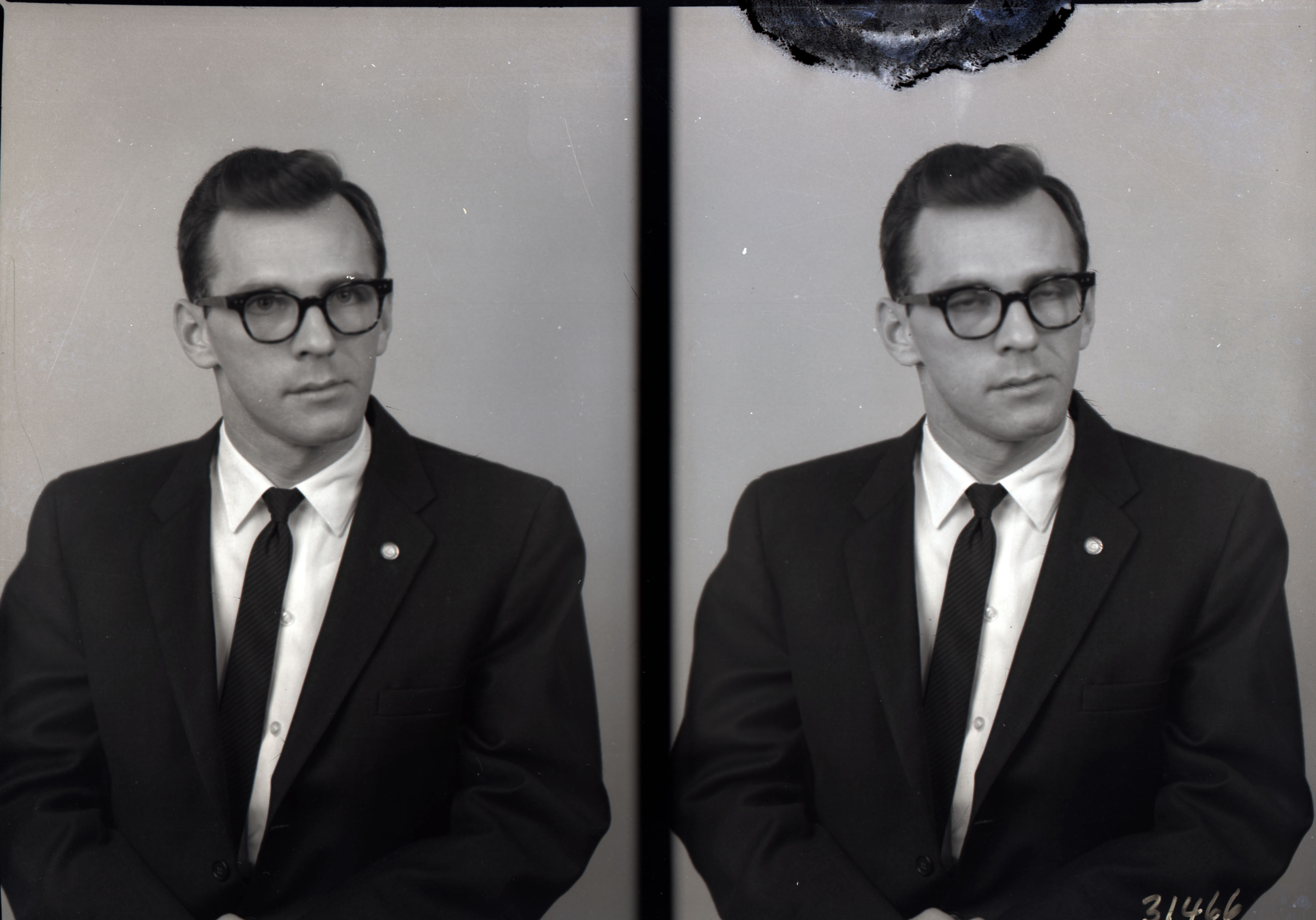 Photo of two separate portrait photographs of William "Bill" Homer Coffman with glasses and wearing a suit and tie.
