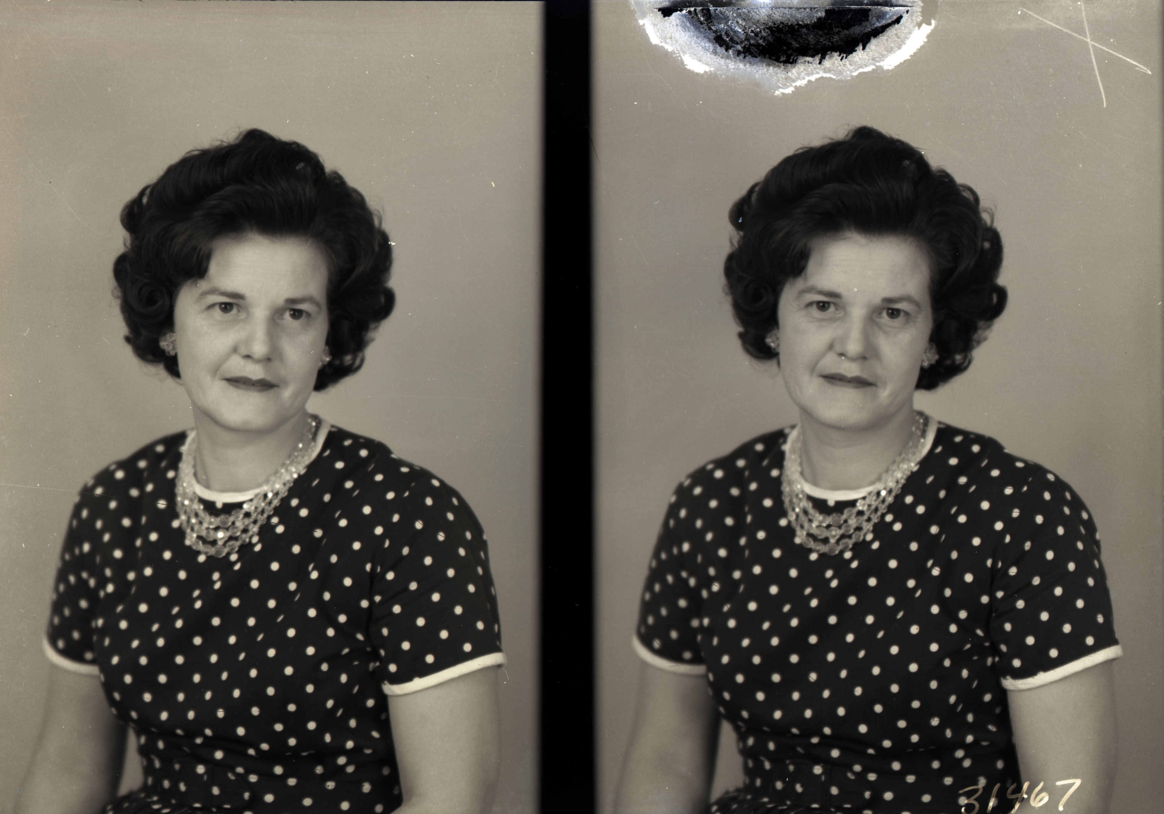 Photo of two separate portrait photographs of the same unidentified woman with short, styled hair and wearing a short-sleeved polka-dotted dress with a necklace.