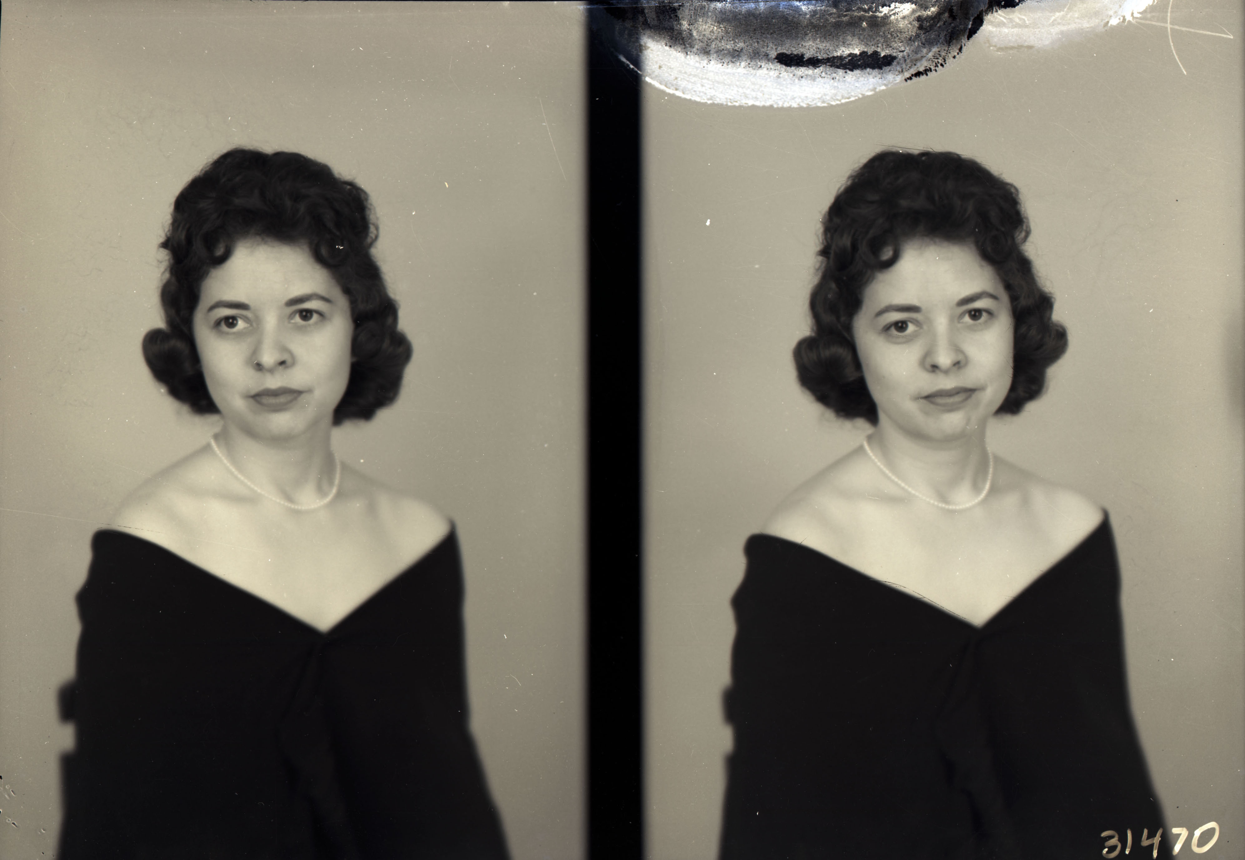 Photo of two separate portrait photographs of the same unidentified woman with short hair and wearing faux pearls and a photographer's drape.