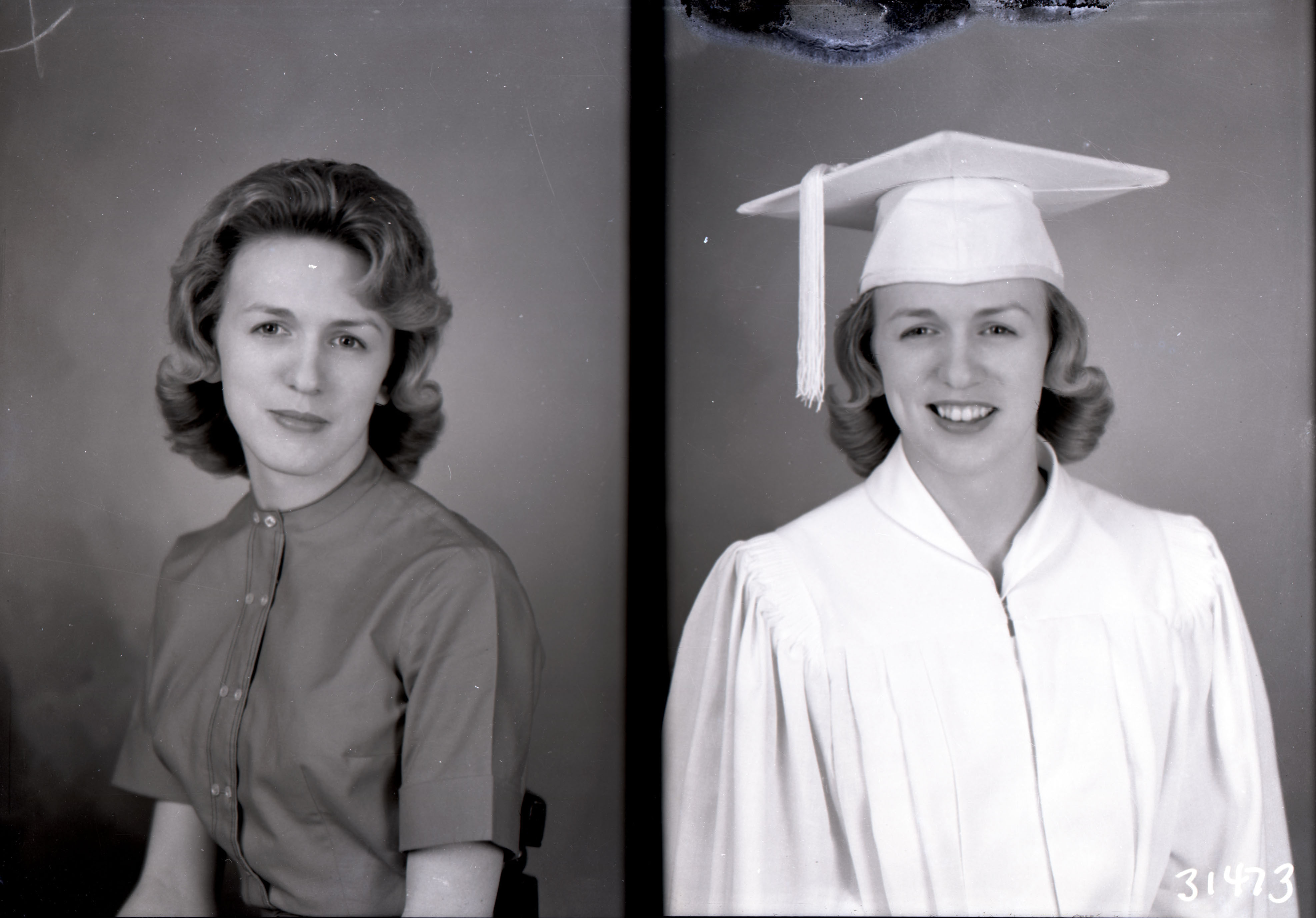 Photo of two separate portrait photographs of Sandra Mantz as a young woman.