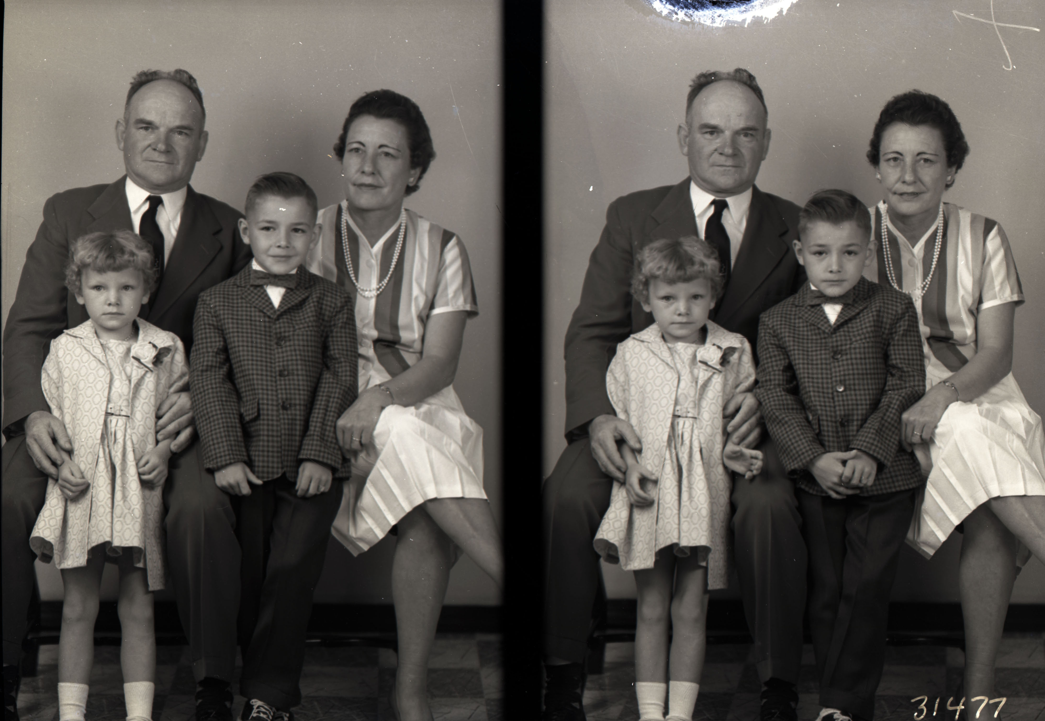 Photo of two separate photographs of an unidentified man and woman posed with two young children, a girl and a boy in a checkered jacket.