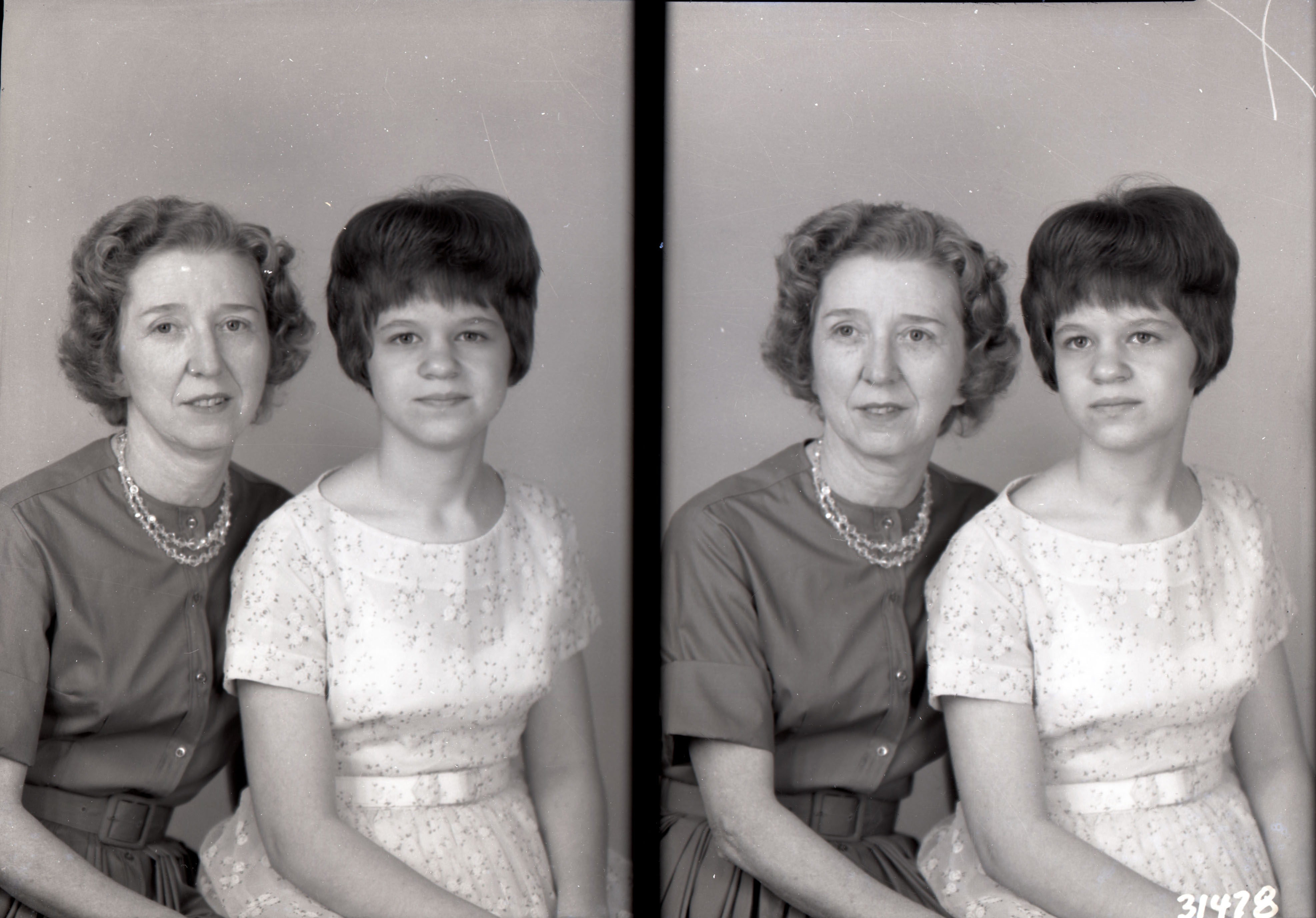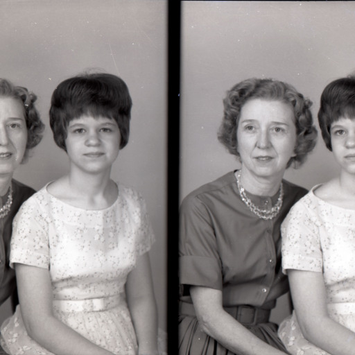 Photo of two separate portrait photographs of the same two women shown seated together. The woman on the left is older than the one on the right.
