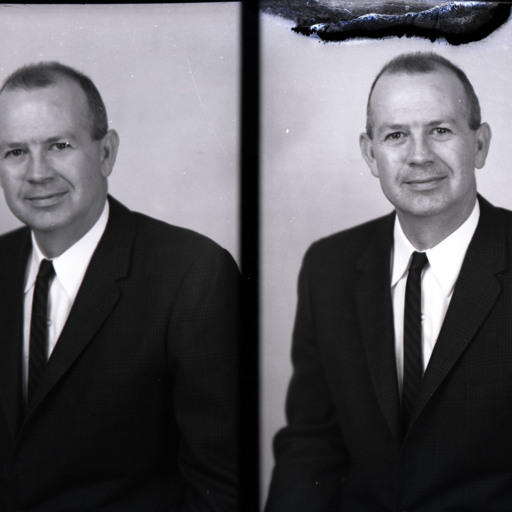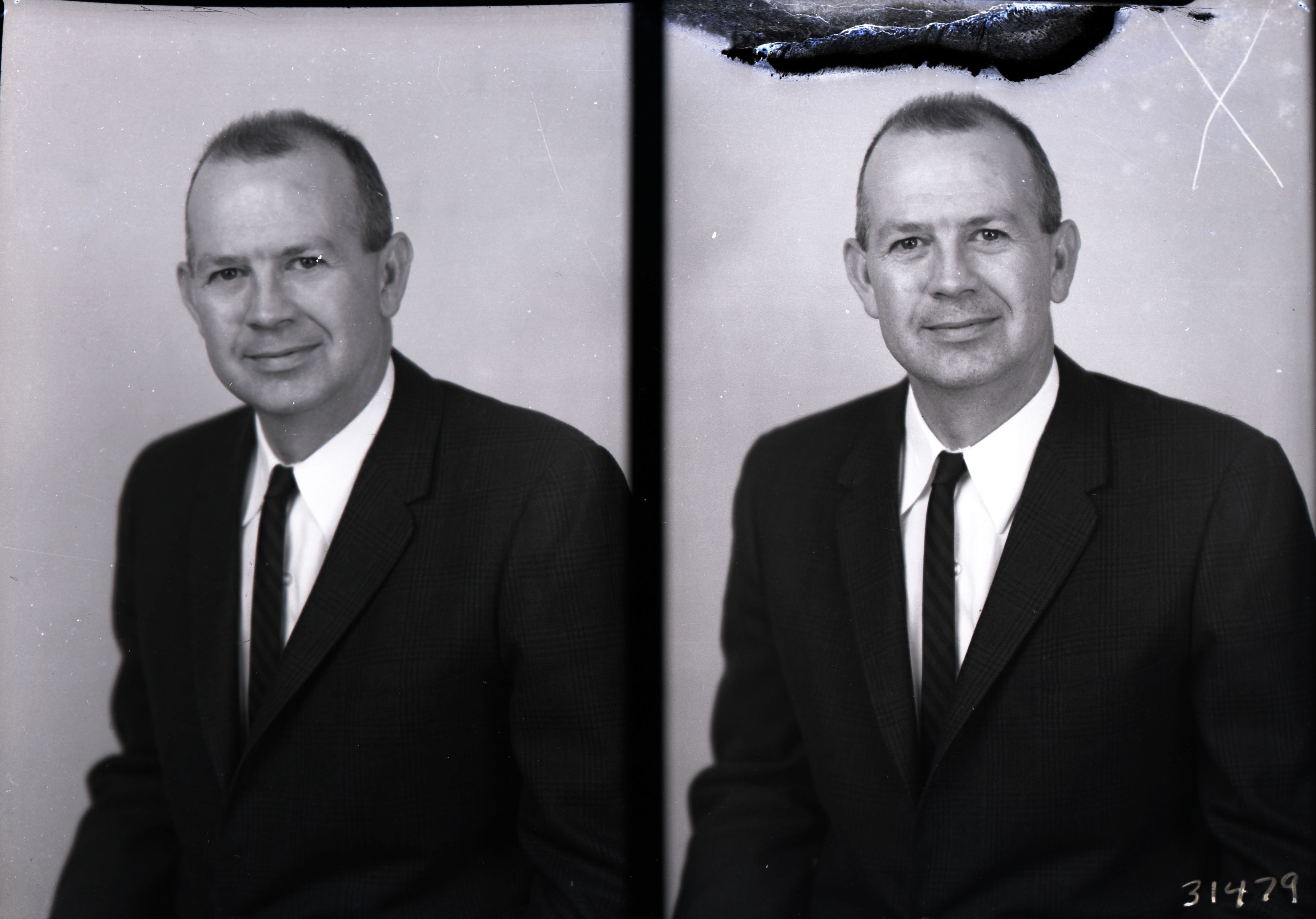 Photo of two separate portrait photographs of the same unidentified man in a suit and tie.