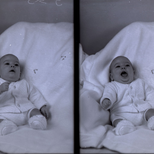 Photo of two separate photographs of the same unidentified baby lying on a covered surface.