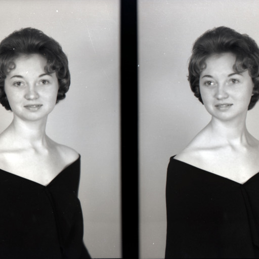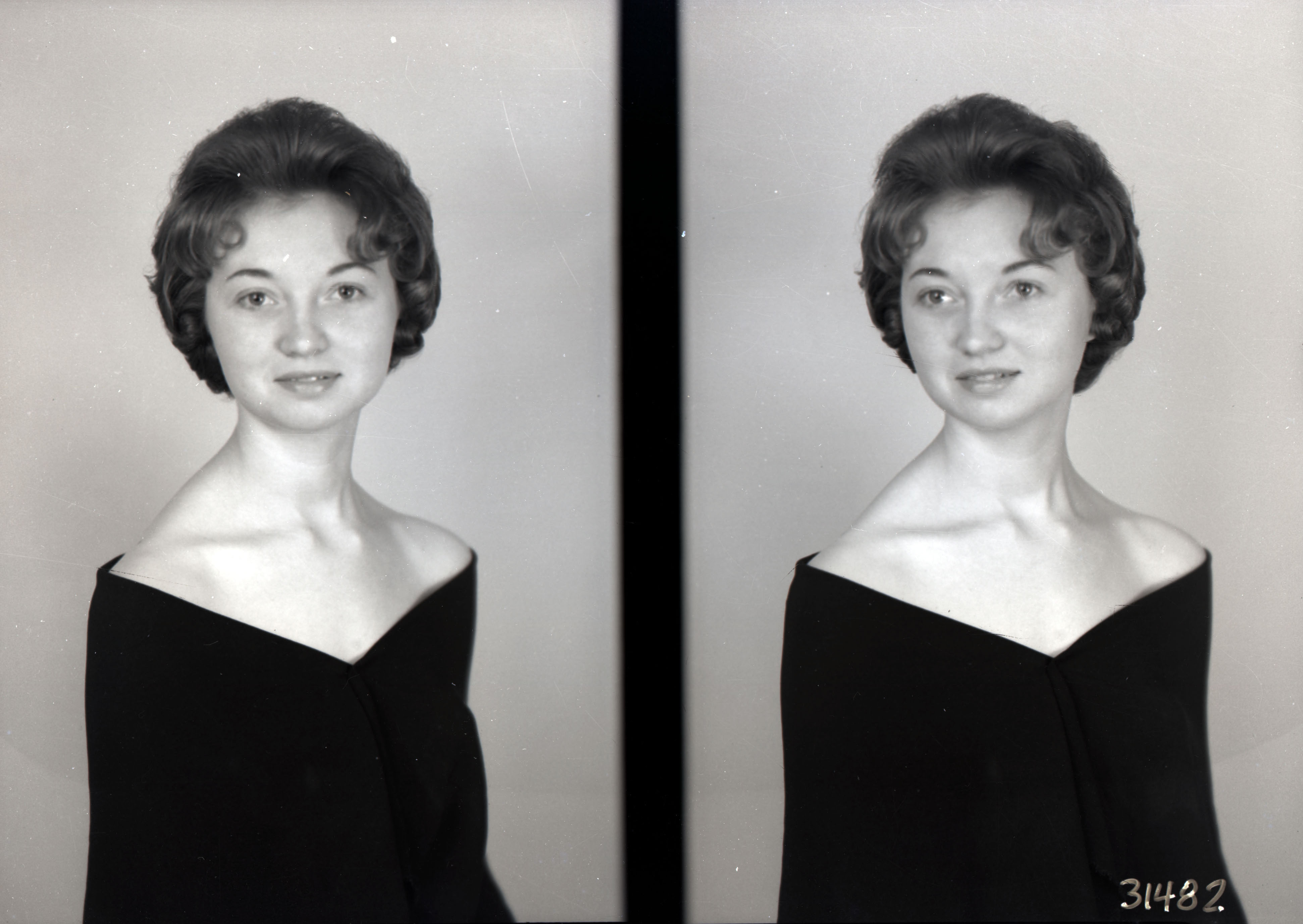 Photo of two separate portrait photographs of the same unidentified young woman with short hair and wearing a photographer's drape.
