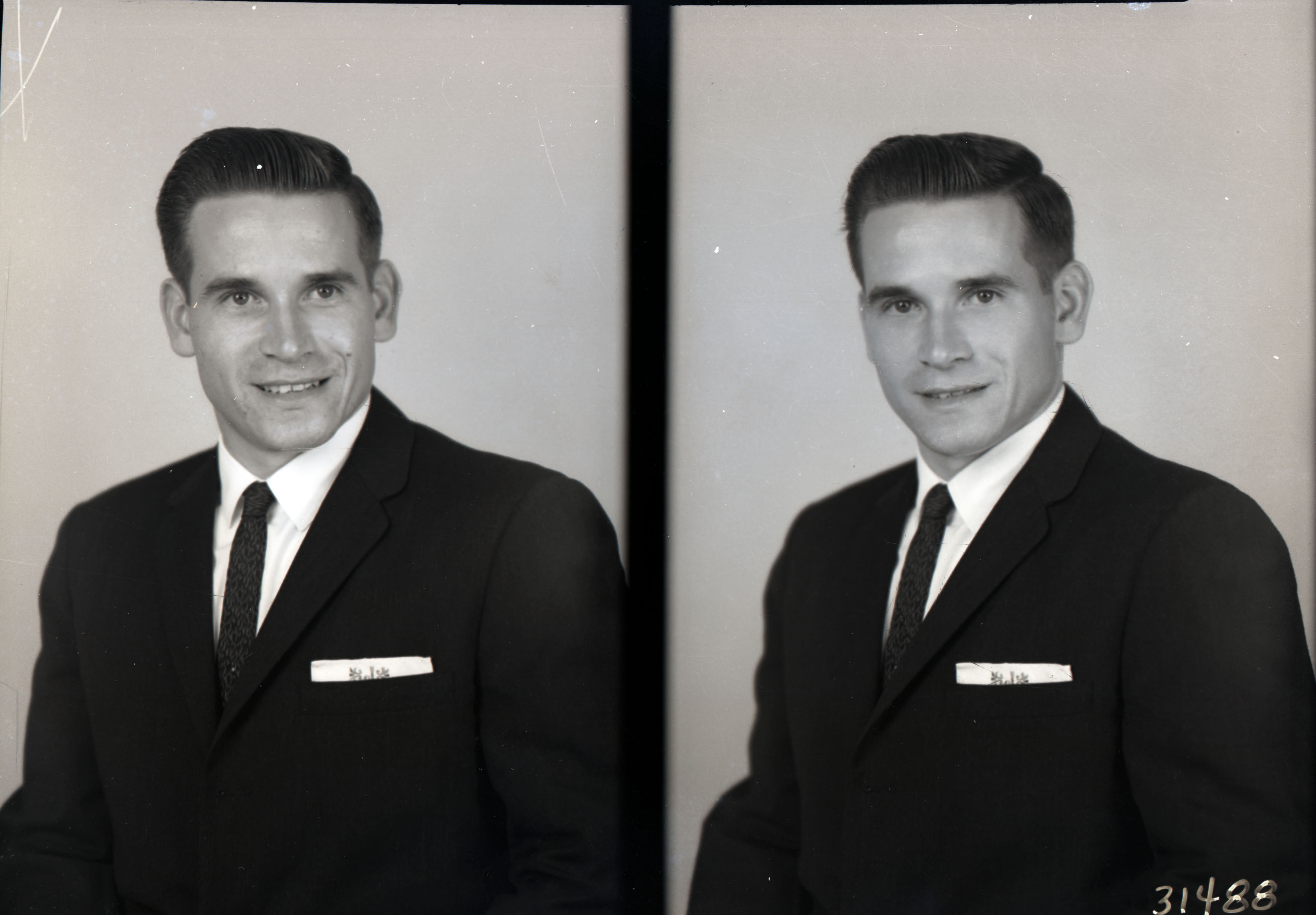 Photo of two separate portrait photographs of Clarence Jones as a young man in a suit and tie. His handkerchief is visible sticking out of his breast pocket.