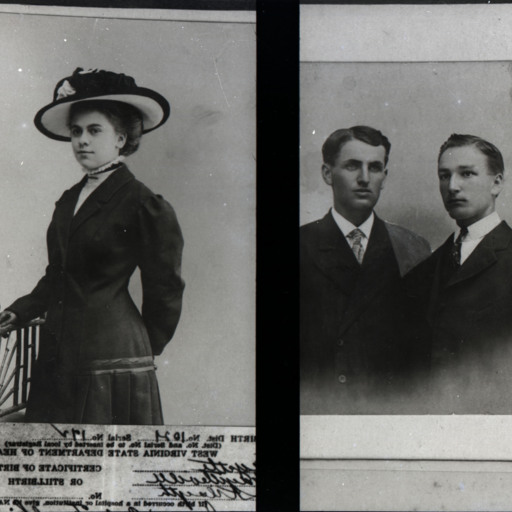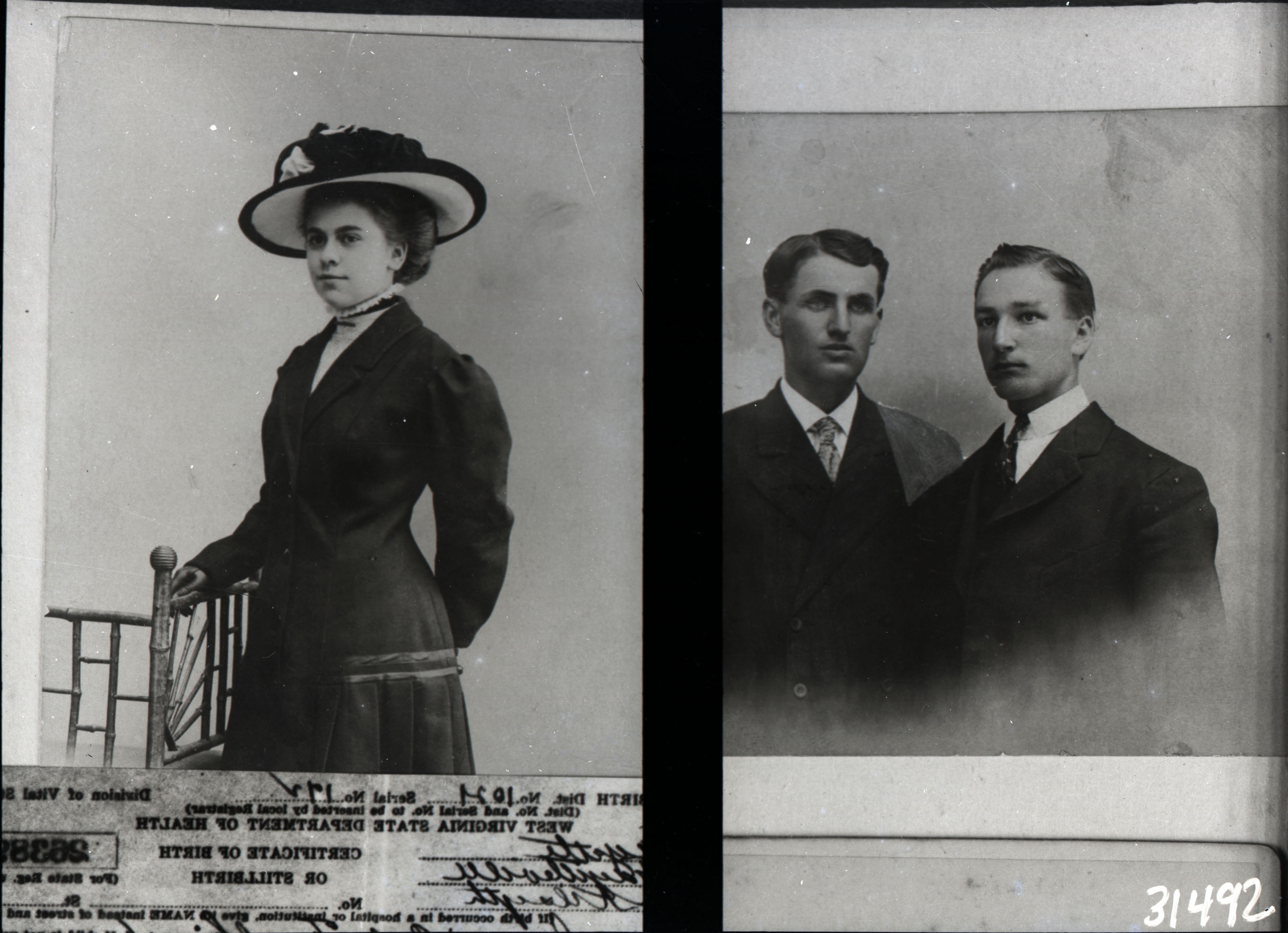 On the left is an unidentified woman in a wide-brimmed hat standing beside a cane chair. Part of a West Virginia birth record appears along the bottom of the image.