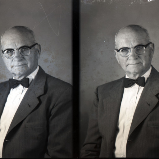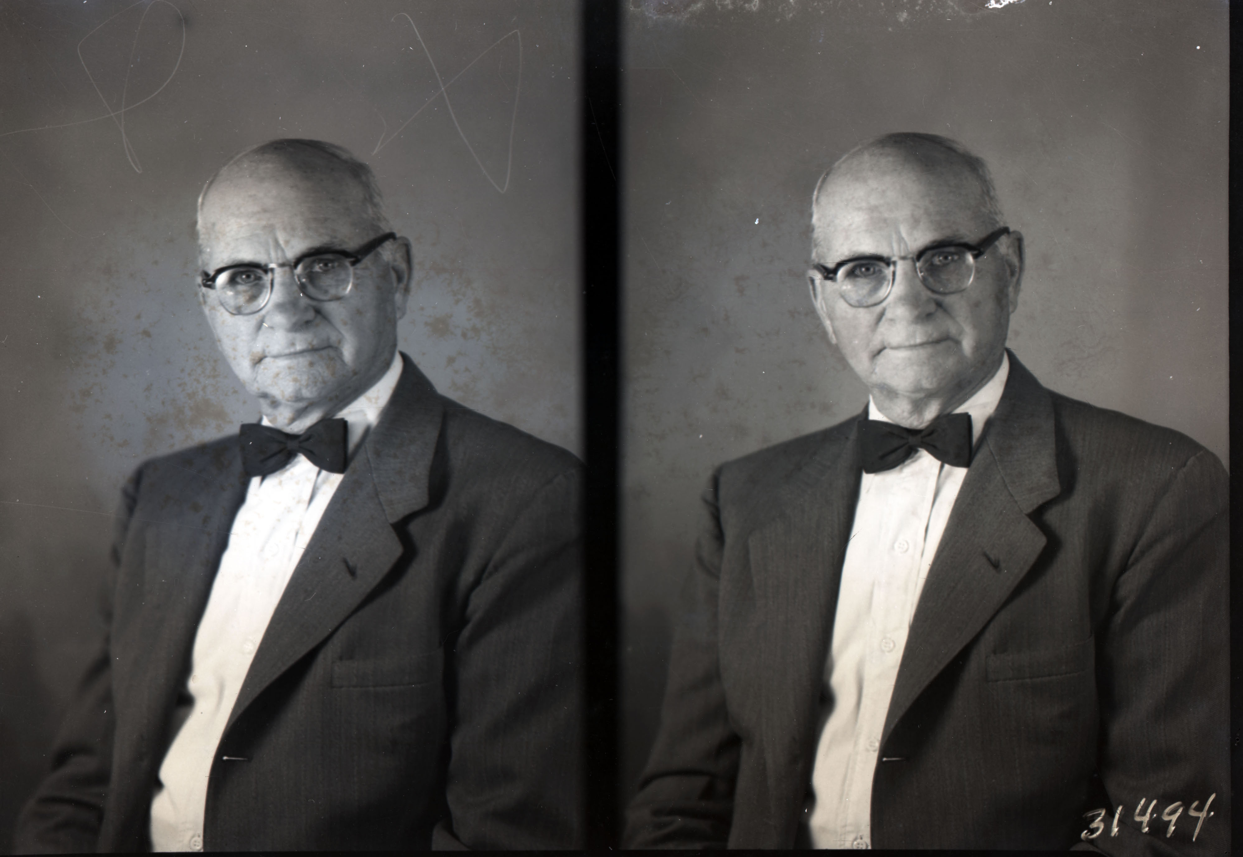 Photo of two separate portrait photographs of an unidentified older man with glasses and wearing a suit and bow tie.