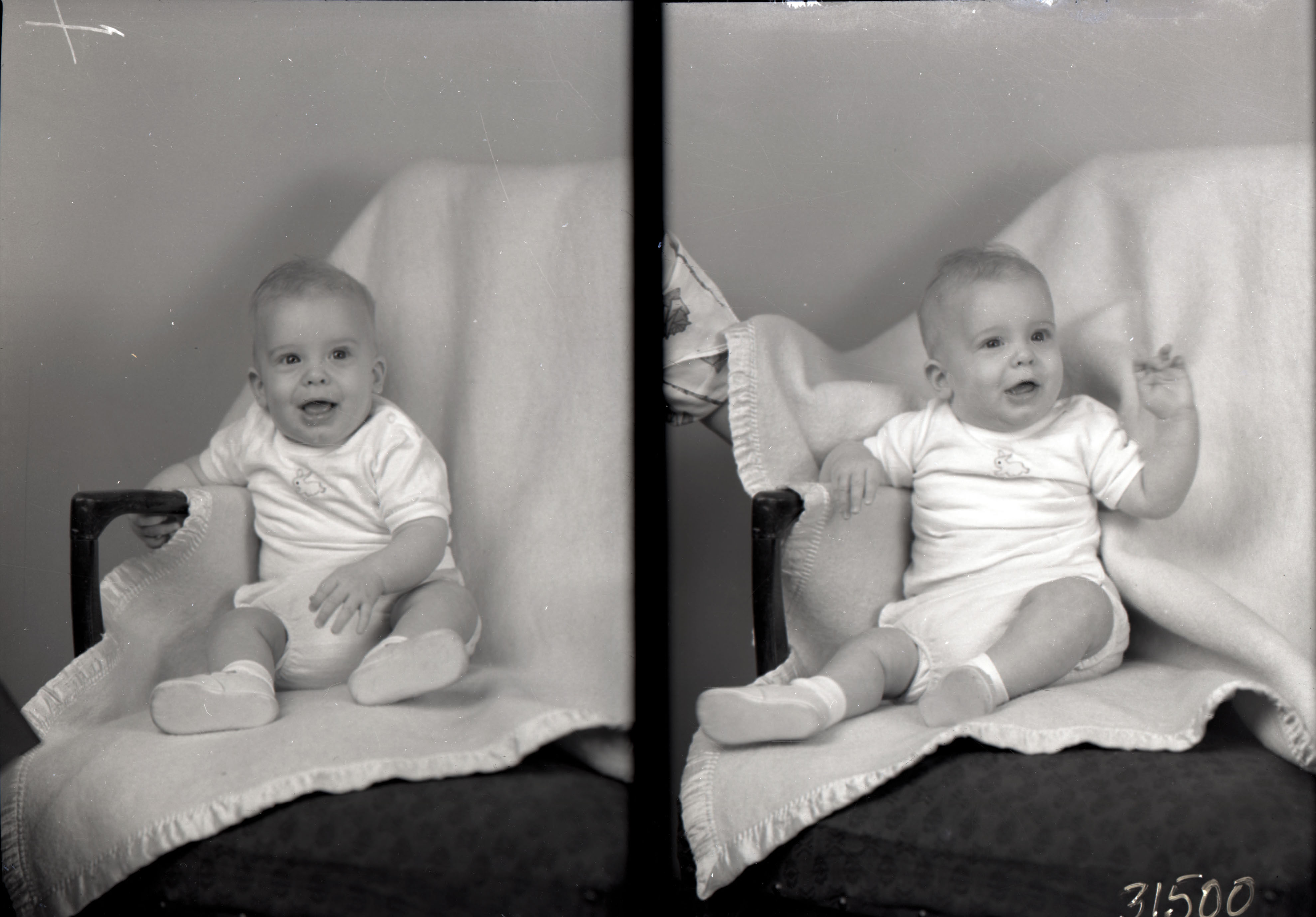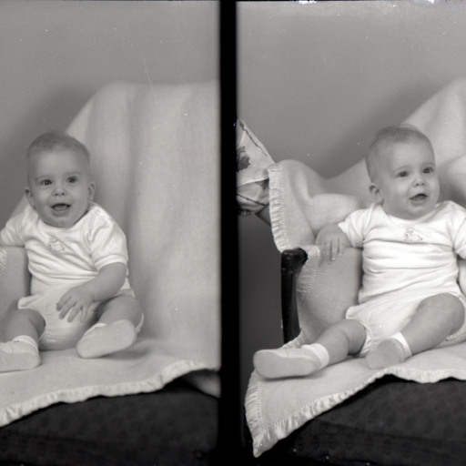 Photo of two separate photographs of an unidentified young child seated on a chair covered with a baby blanket.