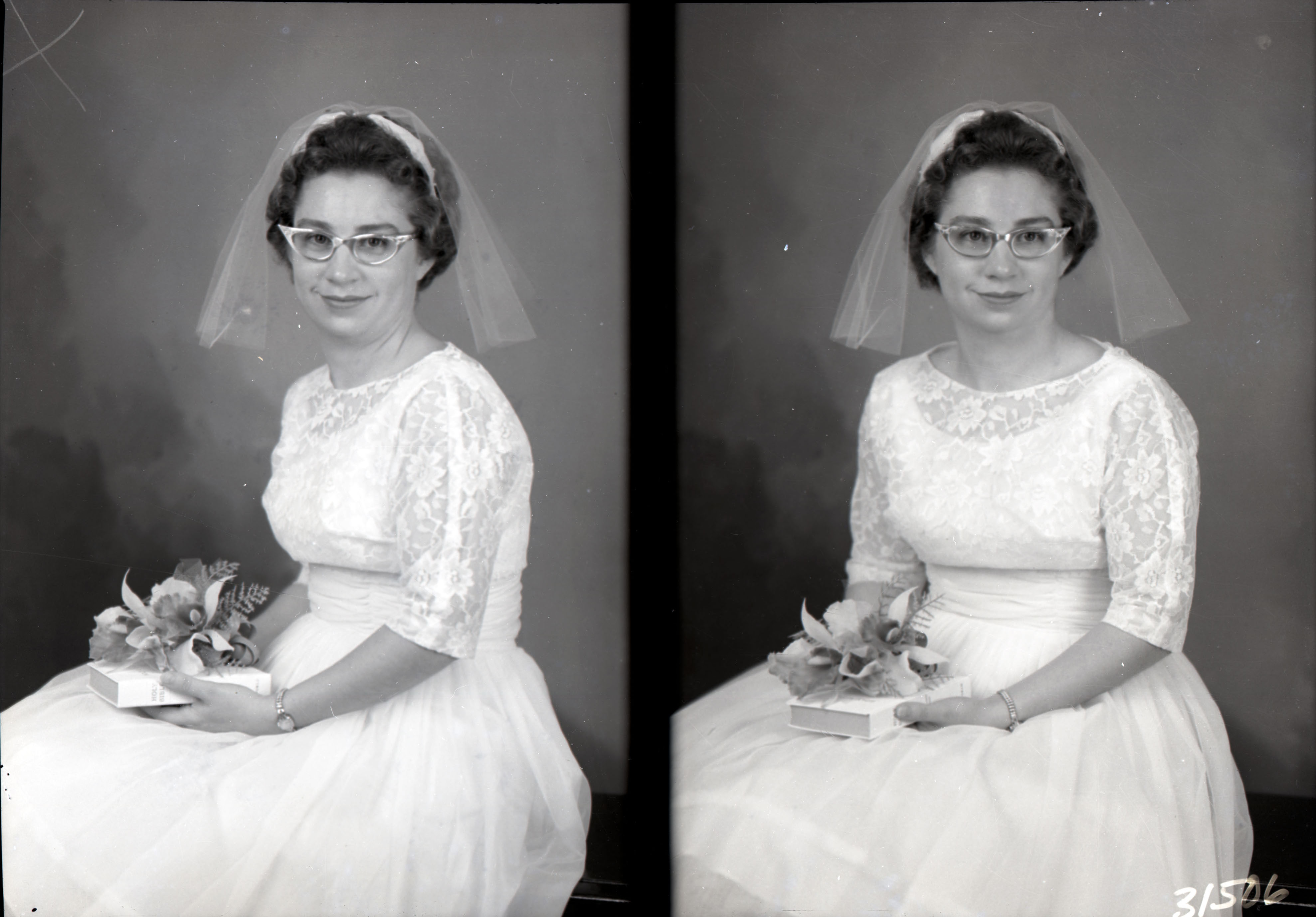 Photo of two separate photographs of the same unidentified older bride with glasses and wearing her wedding gown, veil and bridal bouquet.