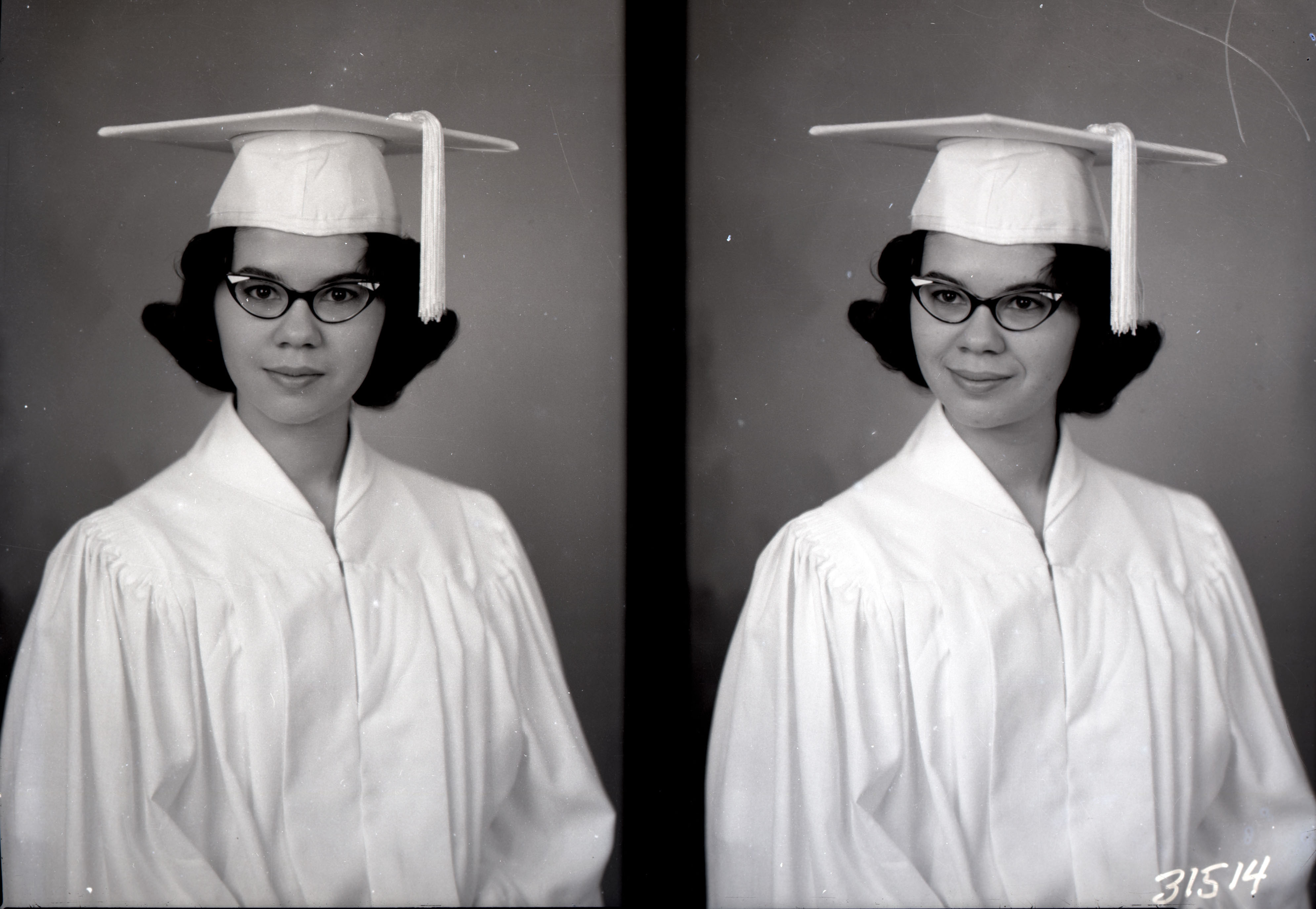 Photo of two separate portrait photographs of the same unidentified young woman with glasses and wearing her graduation cap and gown.
