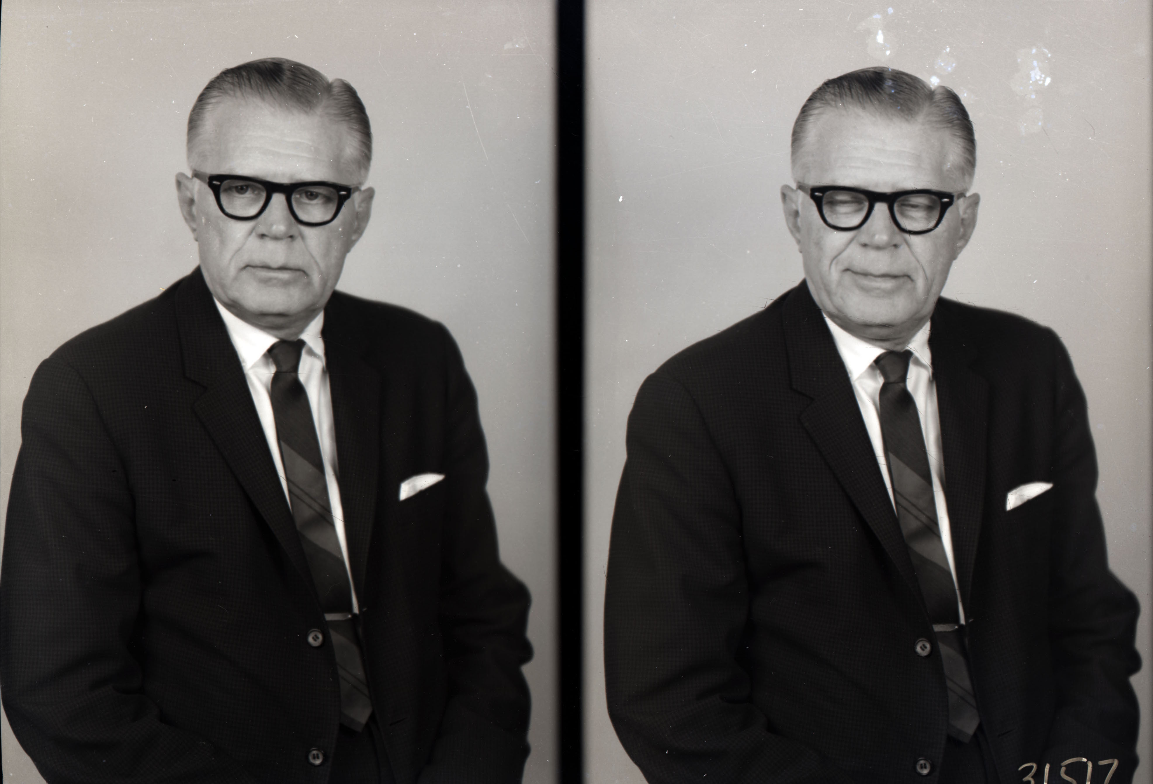 Photo of two separate portrait photographs of the same unidentified older man with glasses and wearing a suit and tie.