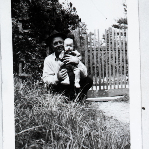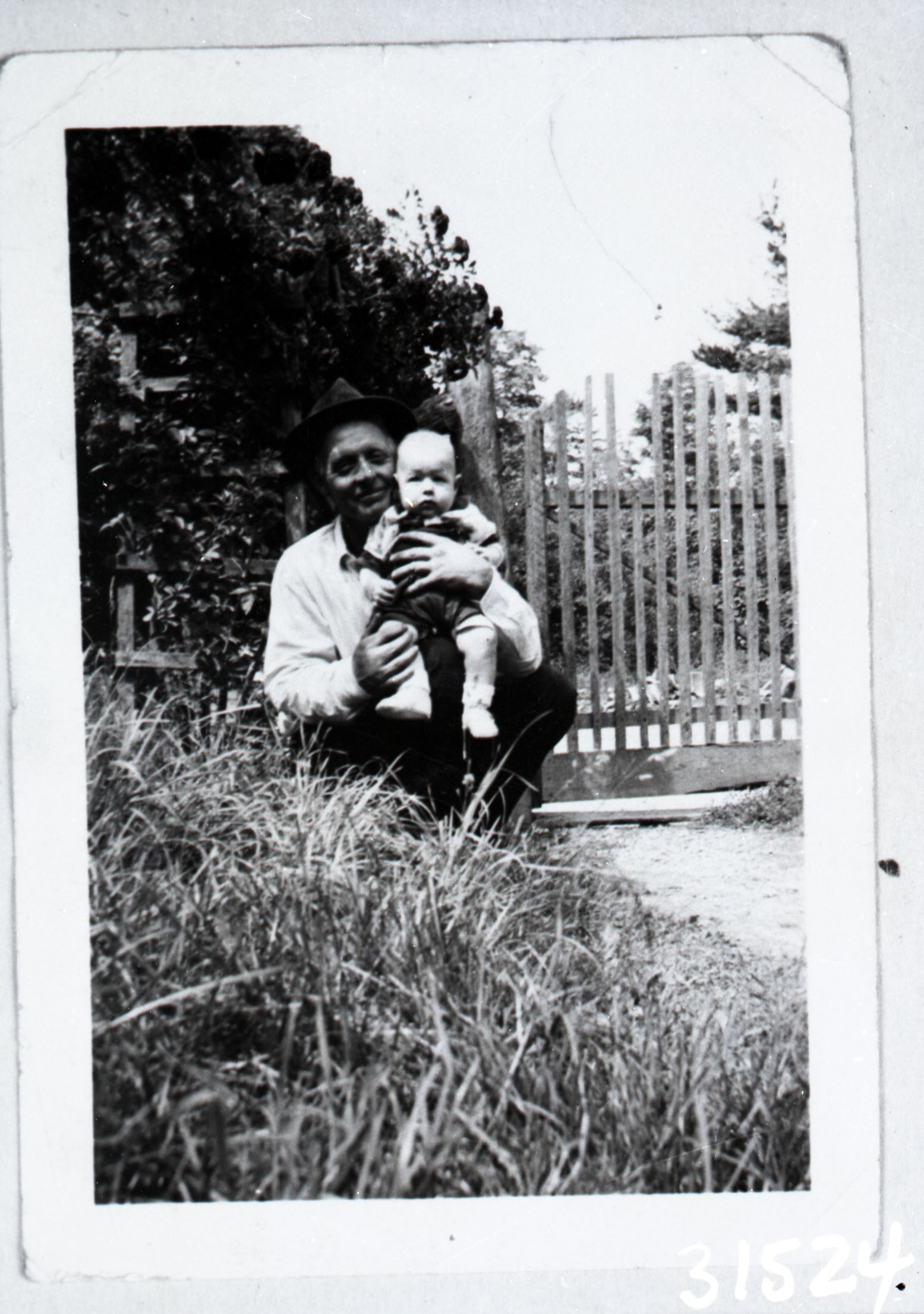 Photo of a photograph of an unidentified man in a hat squatting down outdoors and holding an unidentified young child on his knee. A wood gate is visible behind them.