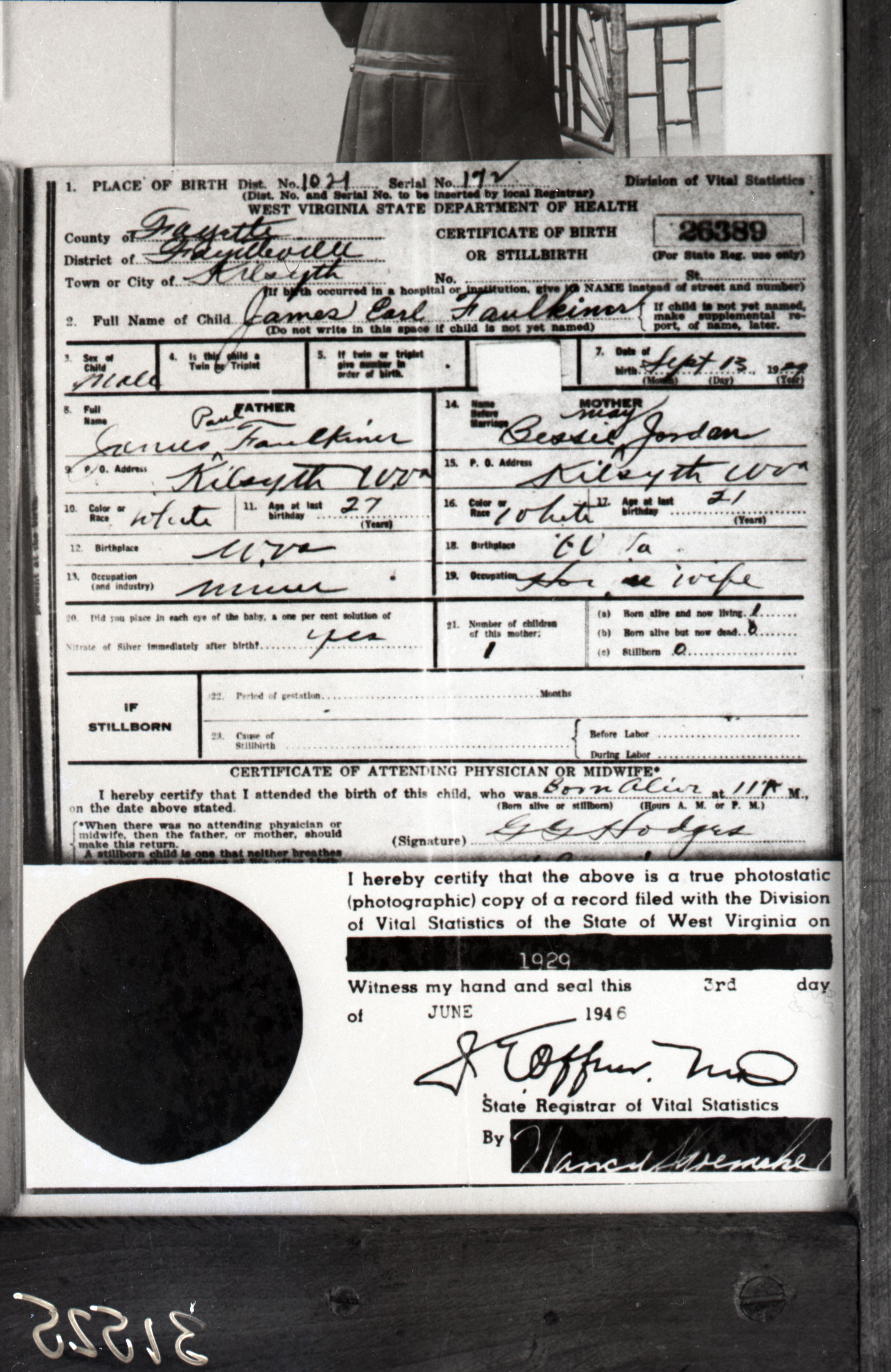 Photo of a certified copy (dated 1946) of the birth record issued by the state of West Virginia for James Earl Faulkiner, born on September 13, 1929, in Kilsyth, West Virginia, to James Paul Faulkiner and Bessie May Jordan.