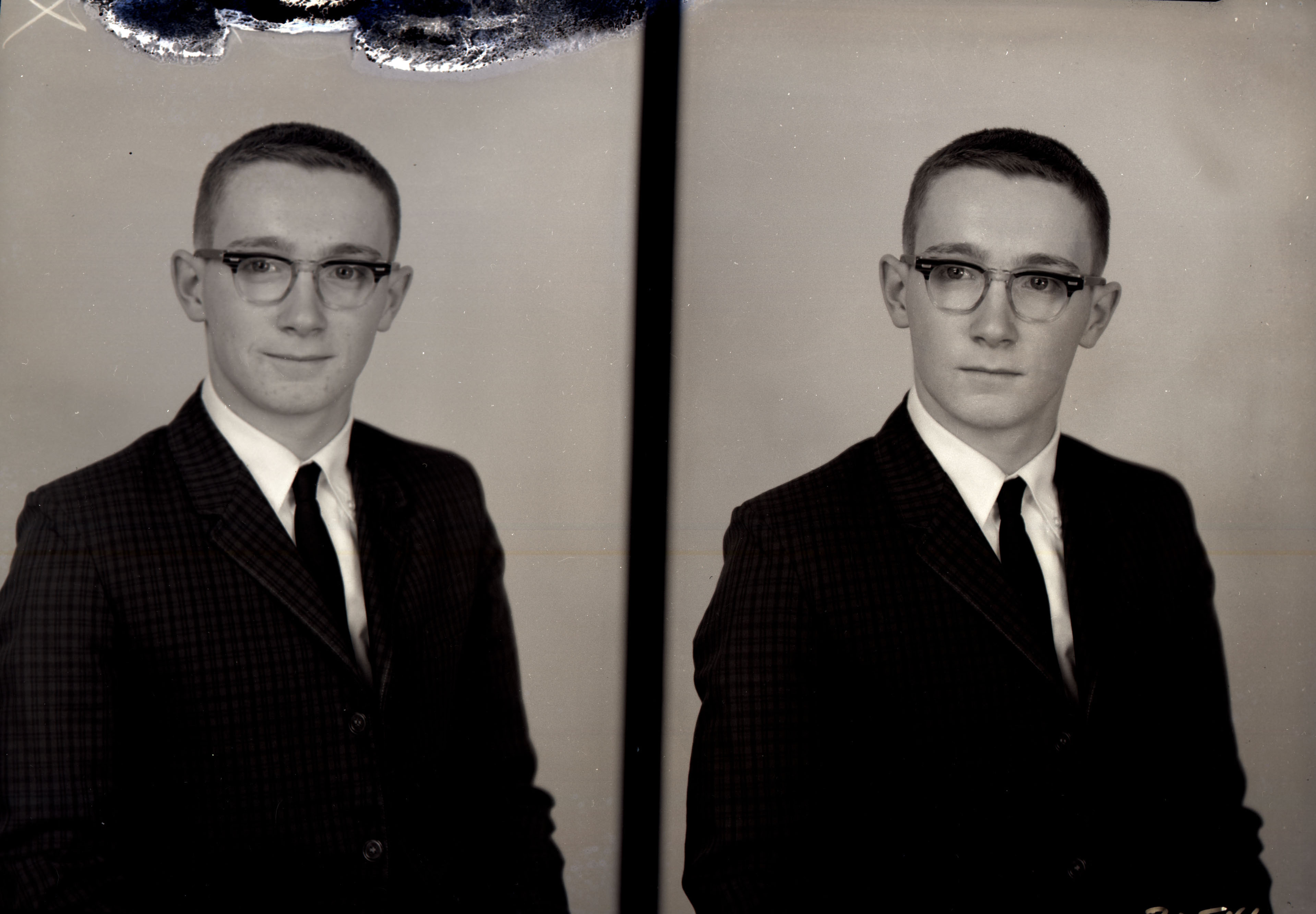 Photo of two separate portrait photographs of the same unidentified young man with glasses and wearing a suit and tie.