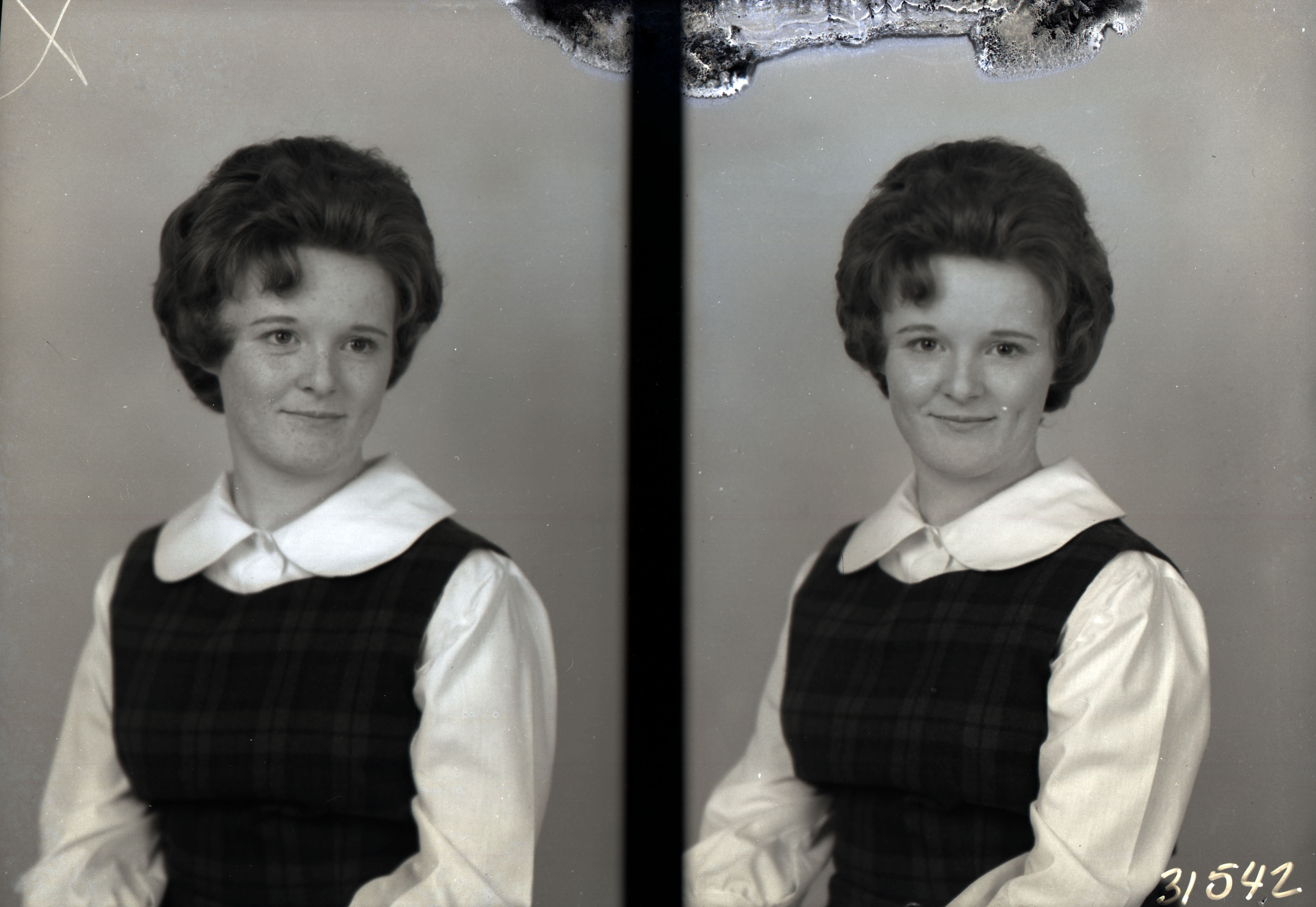 Photo of two separate portrait photographs of the same unidentified woman with short styled hair and wearing a jumper over a blouse.